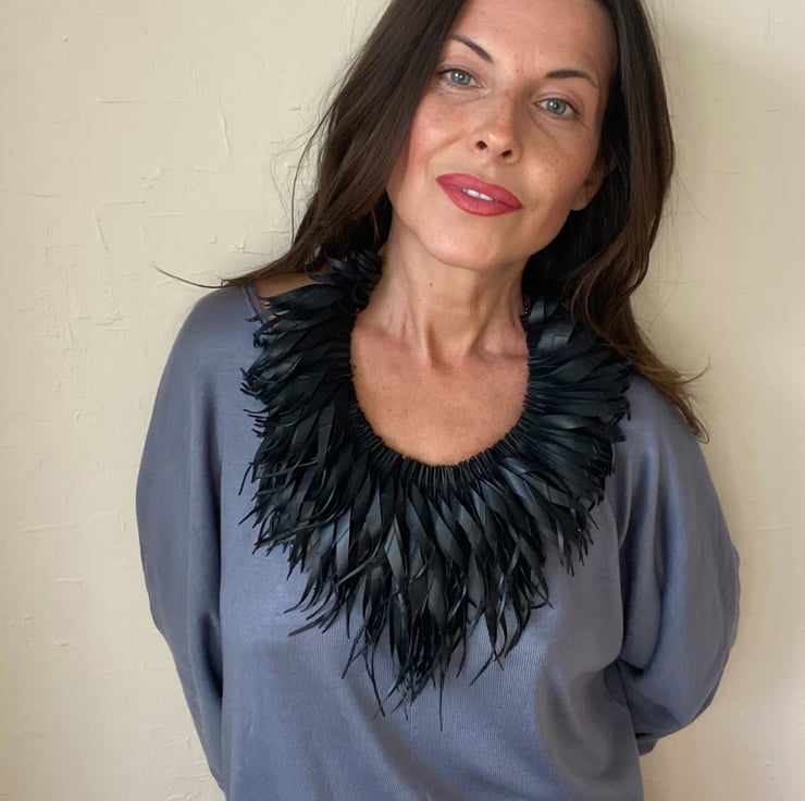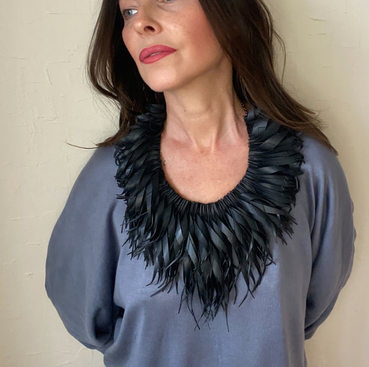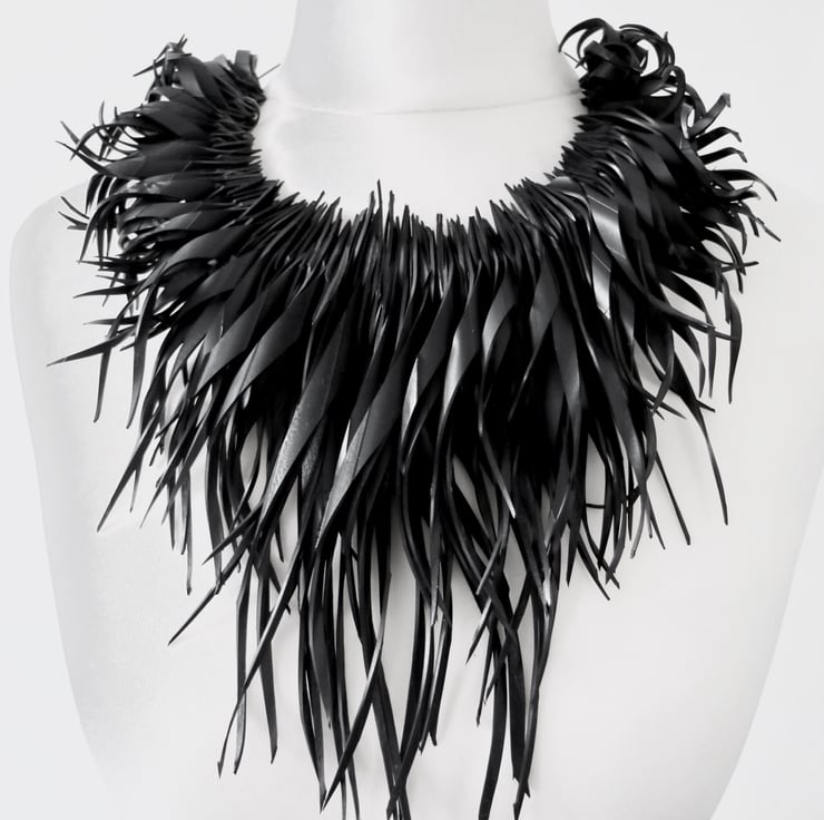This curly tassel necklace has been my signature piece for years, selling successfully through various platforms and events. Crafted from upcycled bicycle inner tubes, it’s a bold, sculptural statement favored by those who love distinctive, eye-catching design.