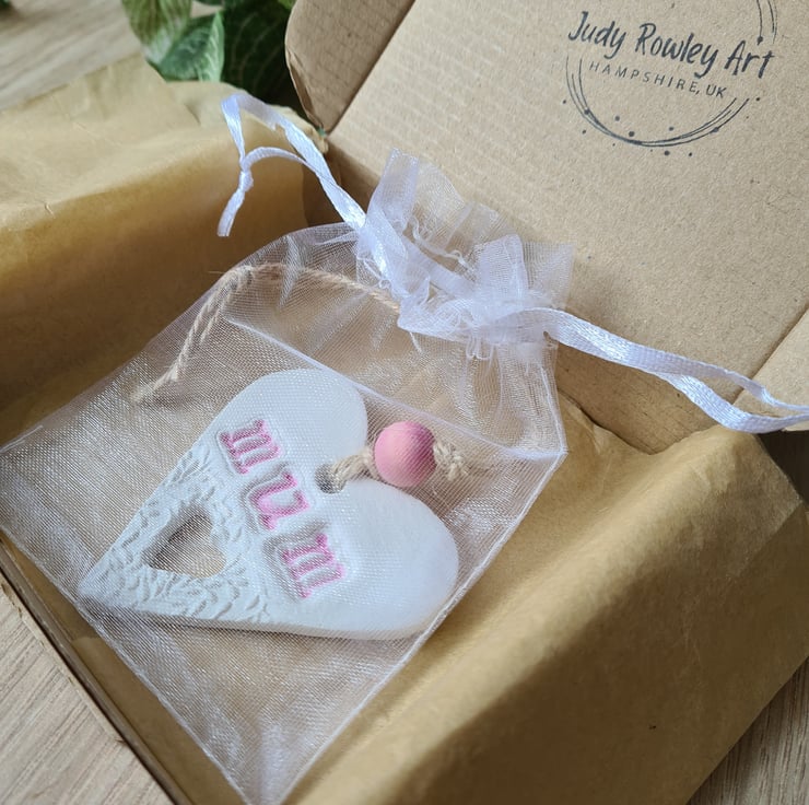 This heart shaped Mother's Day hanging decoration is made from air-drying clay, which has been embossed with a pretty design and has the word 'mum' stamped into the clay and a heart shaped hole! I have handpainted the text in pink and varnished the decoration before finishing with a pink bead and some jute twine.