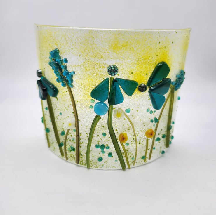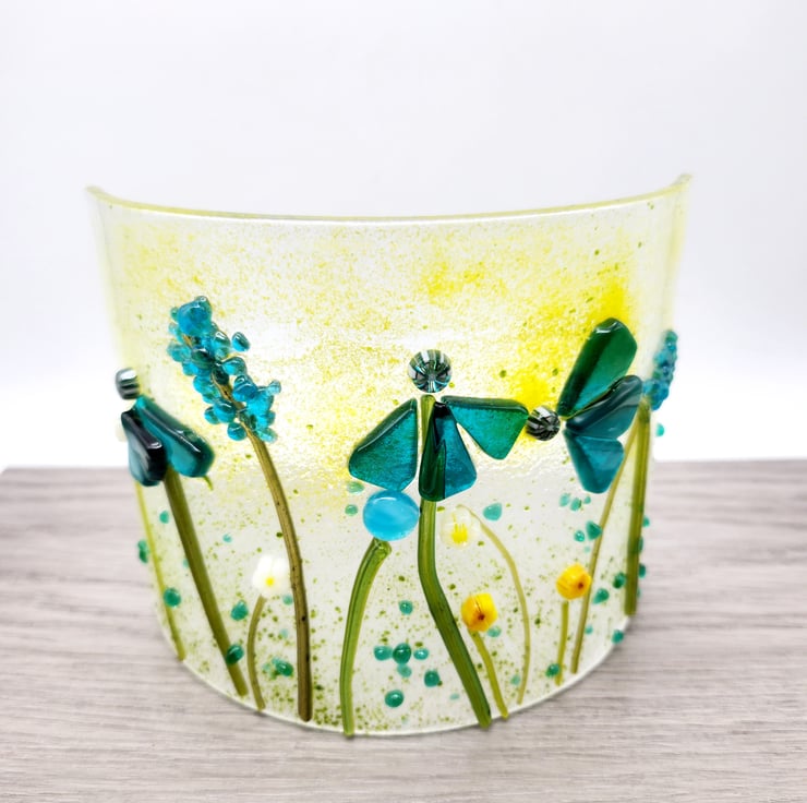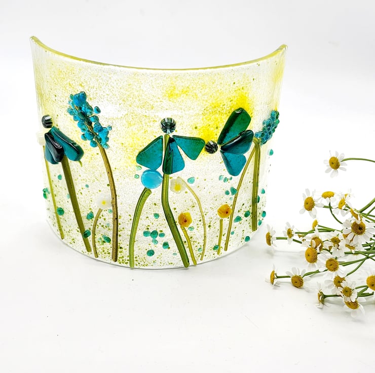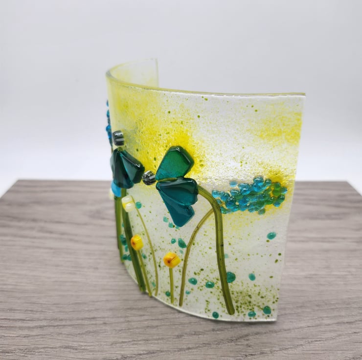 This fused glass standalone curve ornament features a flower meadow in peacock blue and yellow hues. The scene is created by hand-cutting colorful sheets of glass and embellishing them with murrine and sprinkles of finely ground colored glass. The layered glass is first fused in a kiln during the initial firing. After this, it undergoes a second firing in the kiln over a mold, which shapes it into a curve, allowing the ornament to stand freely.