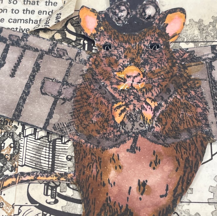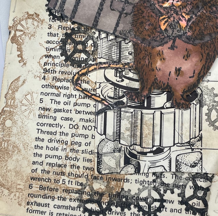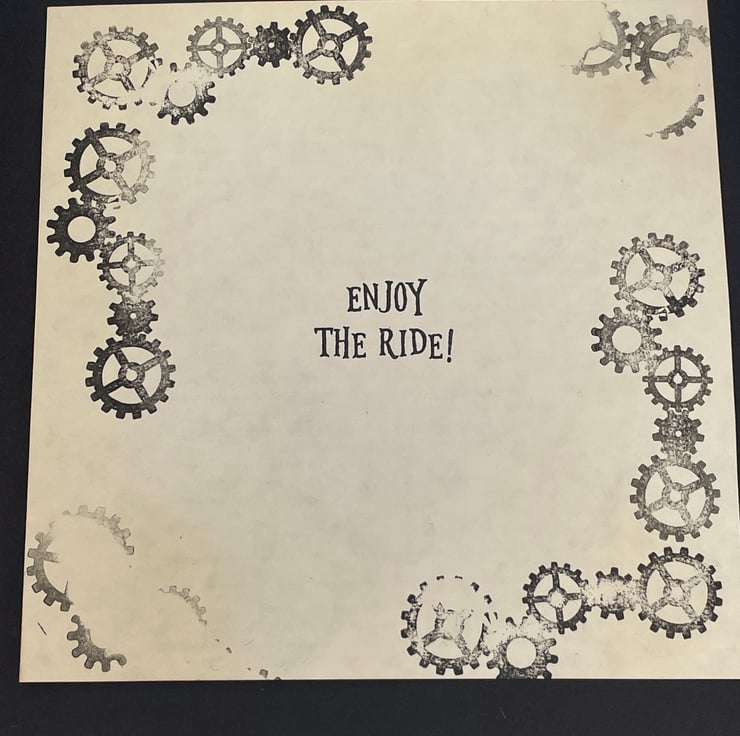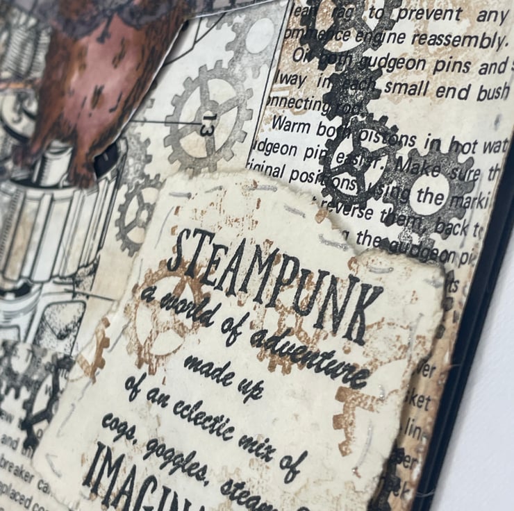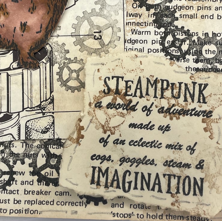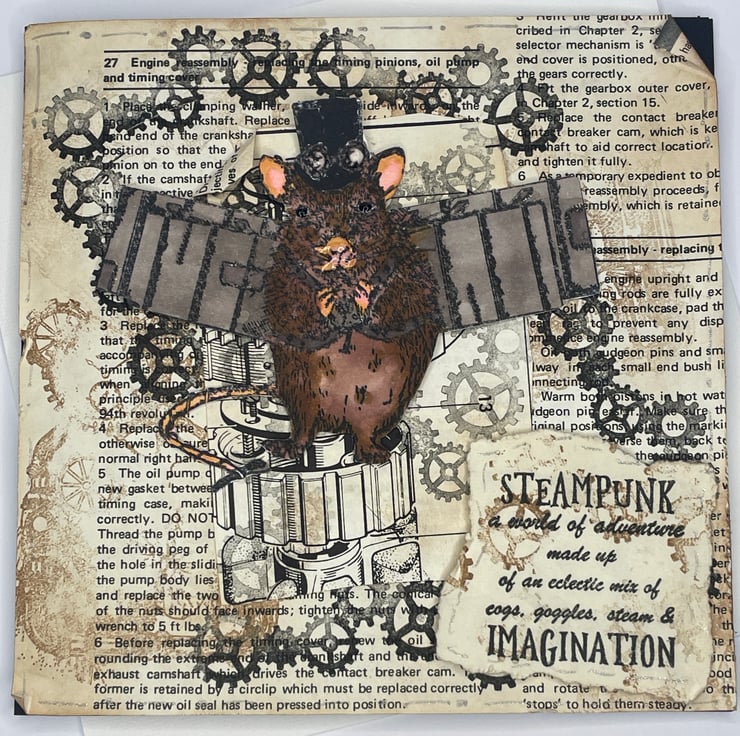 A lovely Steampunk card for the lovers of that very distinctive style. This 15x15cm card is an extravaganza of the Steampunk style. The backing paper is straight out of a vintage Haynes manual adding to the grungy,mechanical style. This is aged with inks and stamps of cogs and other Steampunk images. The main image is of a handsome mouse complete with top hat and flying goggles. He has a pair of wings on that are patched and worn. The greeting says Steampunk a world of adventure made up of an eclectic mix of cogs, goggles, steam and imagination. Inside has more old paper with cogs and the greeting Enjoy the ride.