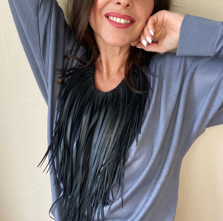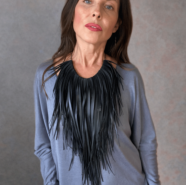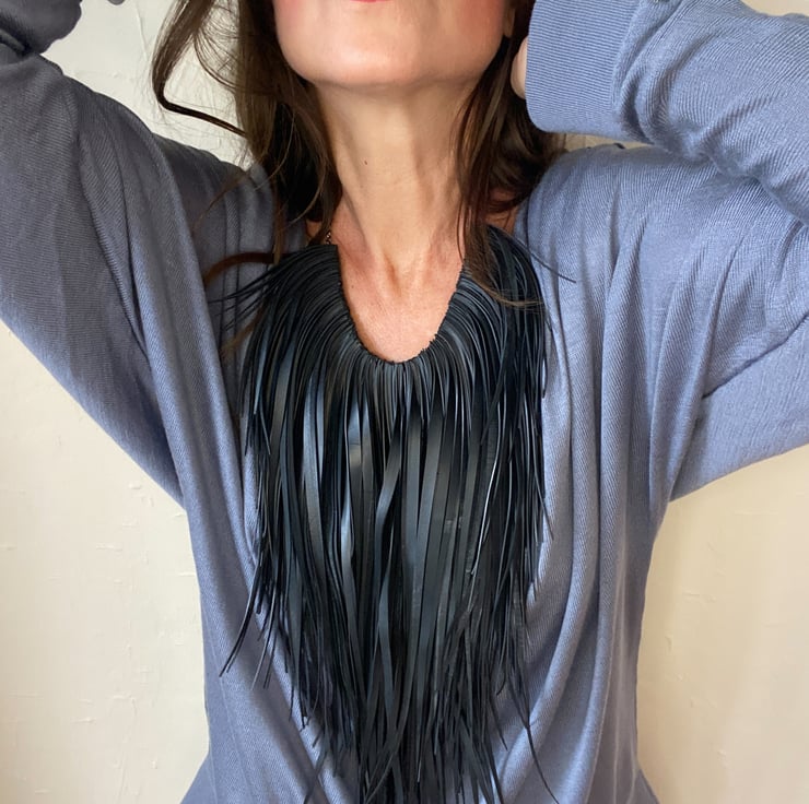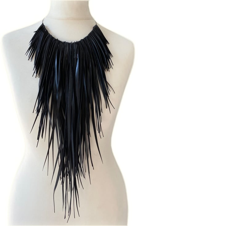 Make a bold statement with this 14-inch black tassel necklace, crafted from upcycled bicycle inner tubes. The textured tassels add a distinctive edge to the design, making this eco-friendly accessory the perfect choice for those who love to stand out. Weighing 250g, it offers a solid, statement-making feel that sets it apart from typical necklaces.