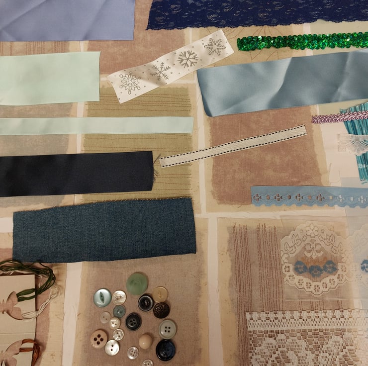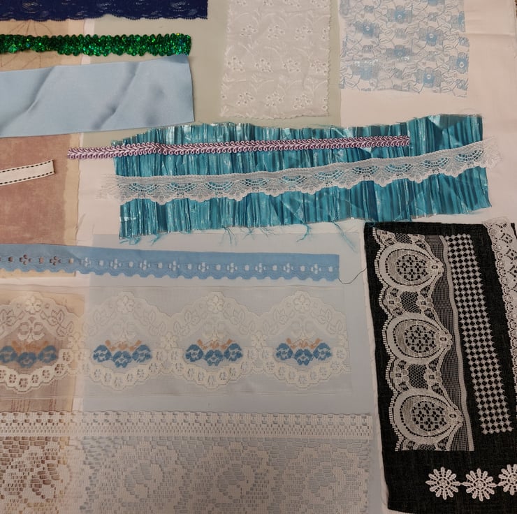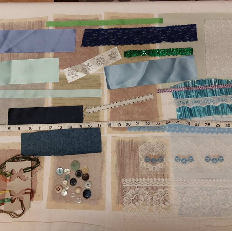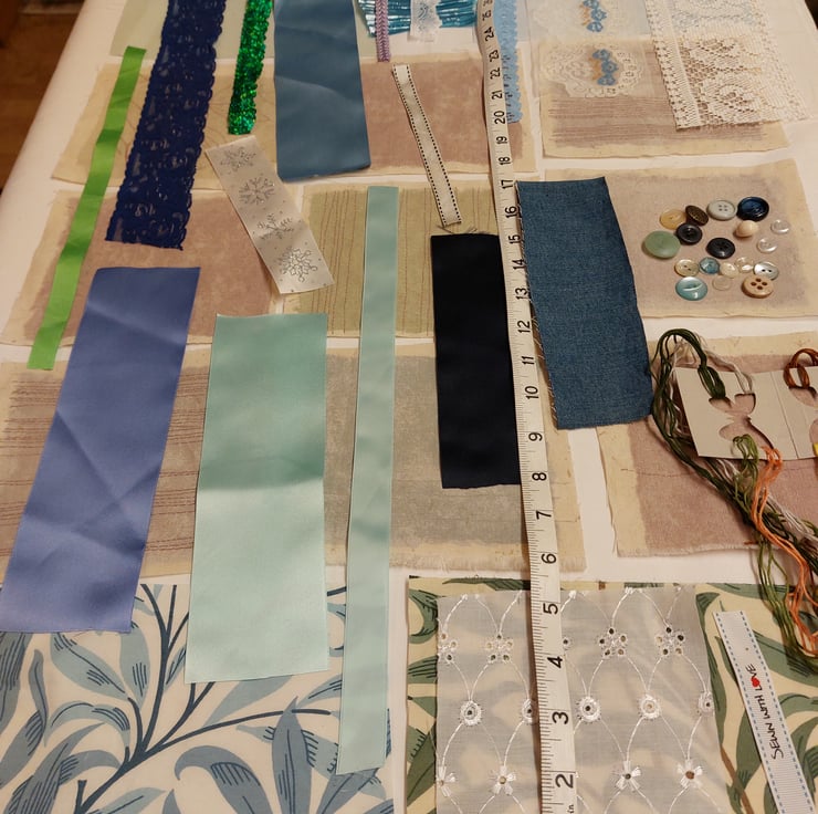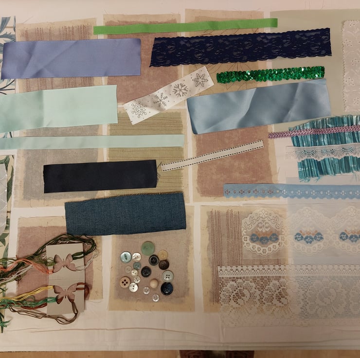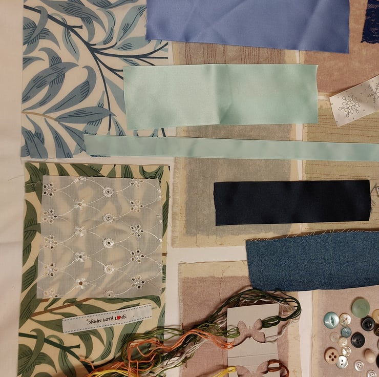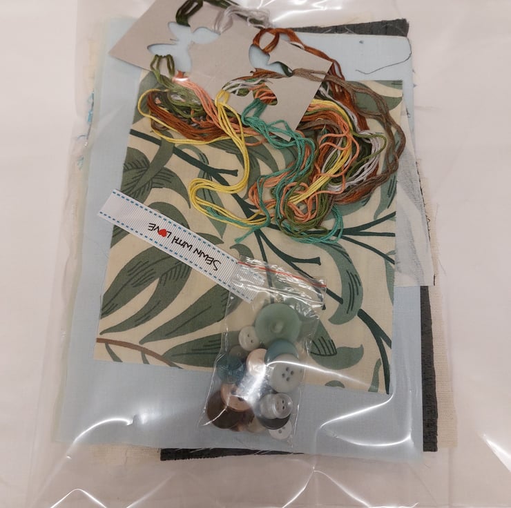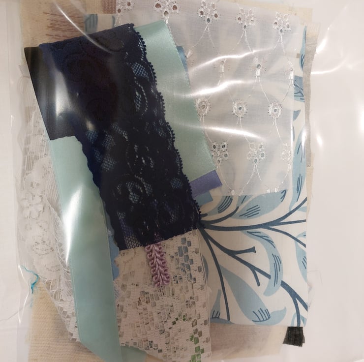 A mixture of 19 fabrics, 9 ribbons, 4 trims, 7 lace pieces, all in varying lengths. Embroidery threads, sewn with love label and a handful of vintage buttons complete the kit. Everything you need to start your slow stitching journey,