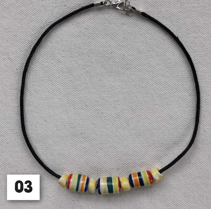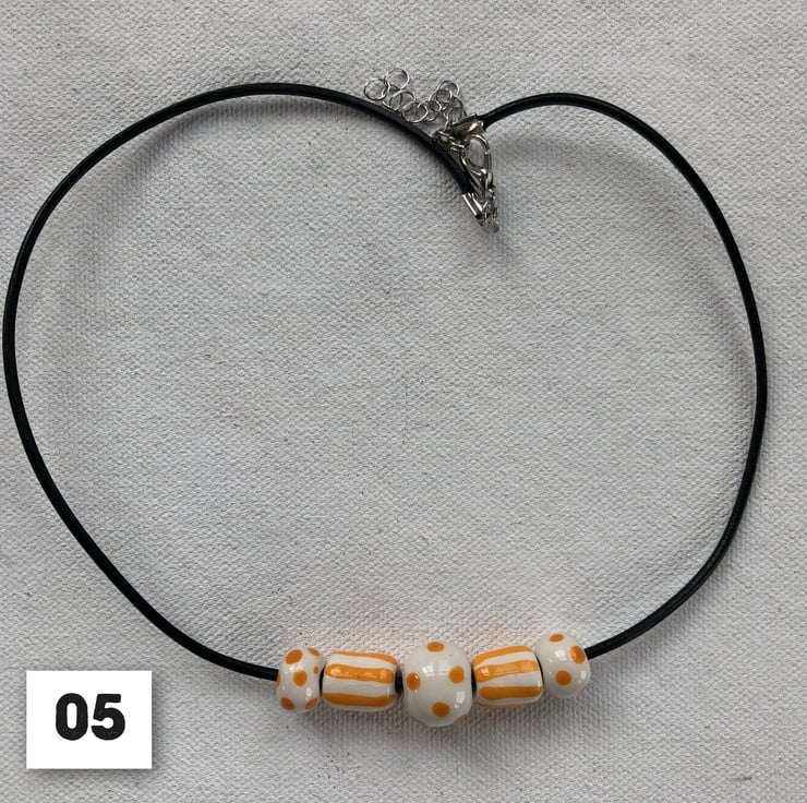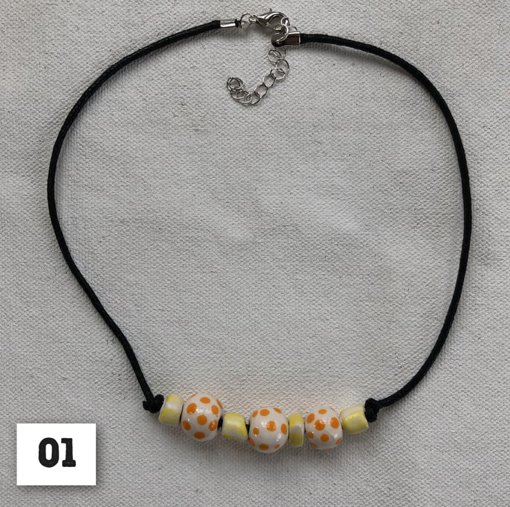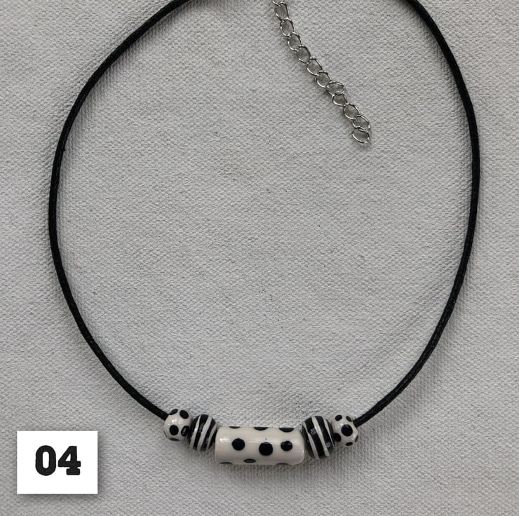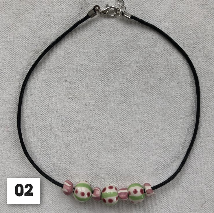 Hand-made and hand-painted beads, strung onto 2mm waxed cotton cord. Each necklace is adjstable and has a minimum size of 14 inches and maximum of 16 inches circumference. Each necklace is a unique creation.