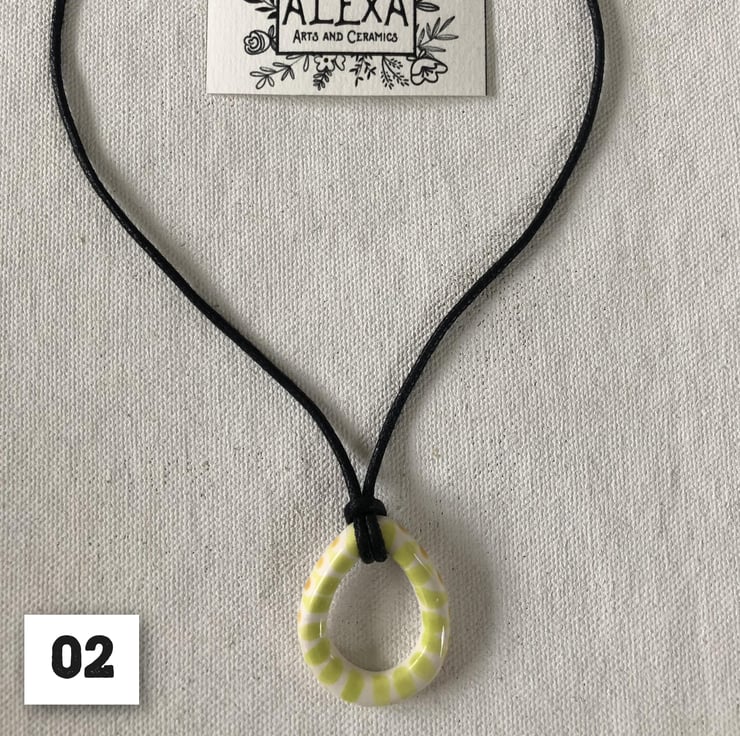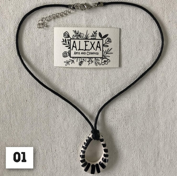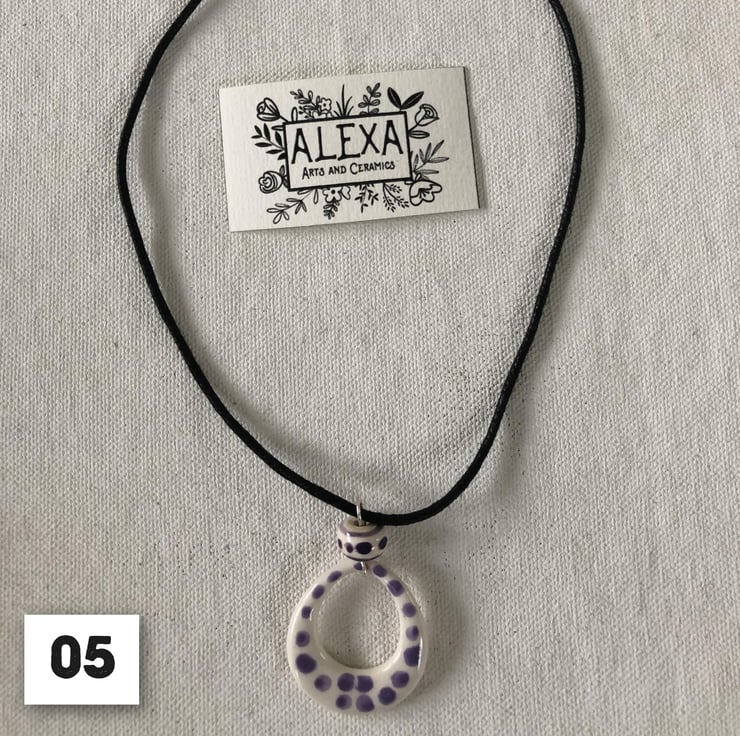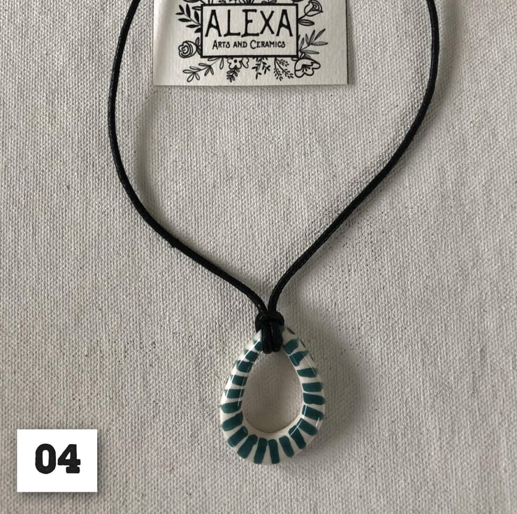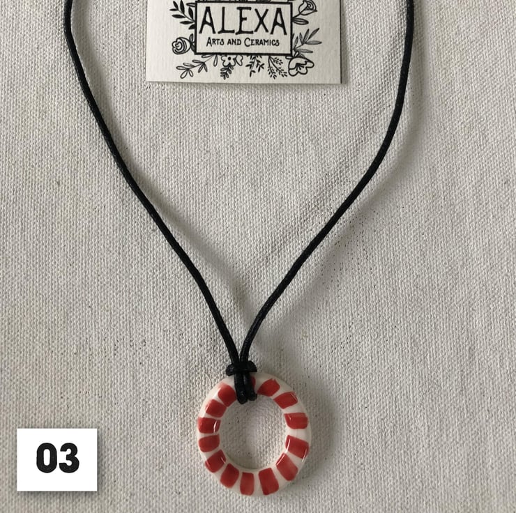 Hand-made and hand-painted pendants, strung onto 2mm waxed cotton cord. Each necklace is adjstable and has a minimum size of 14 inches and maximum of 16 inches circumference. Each pendant necklace is a unique creation.