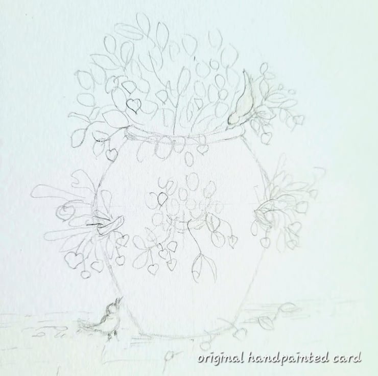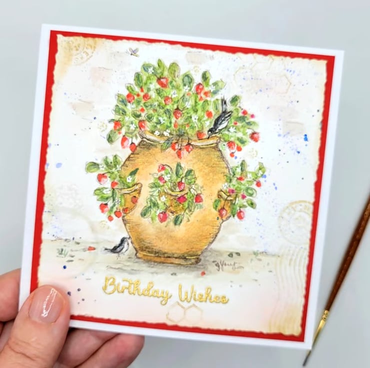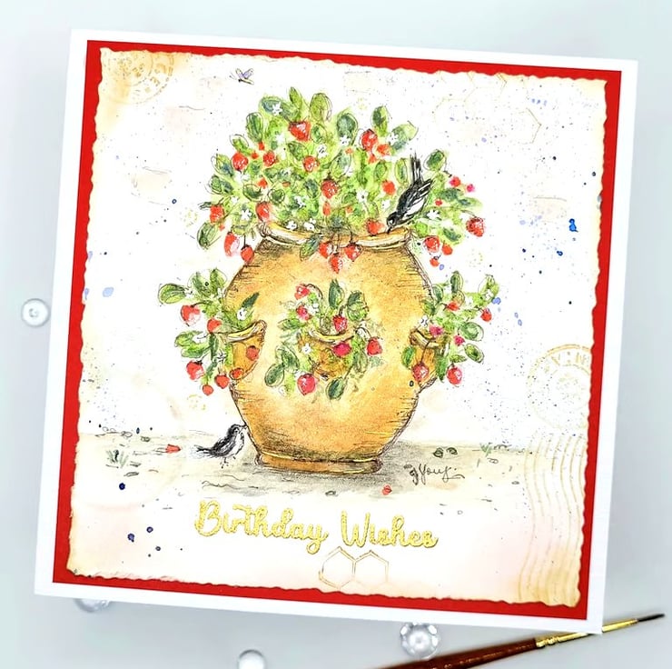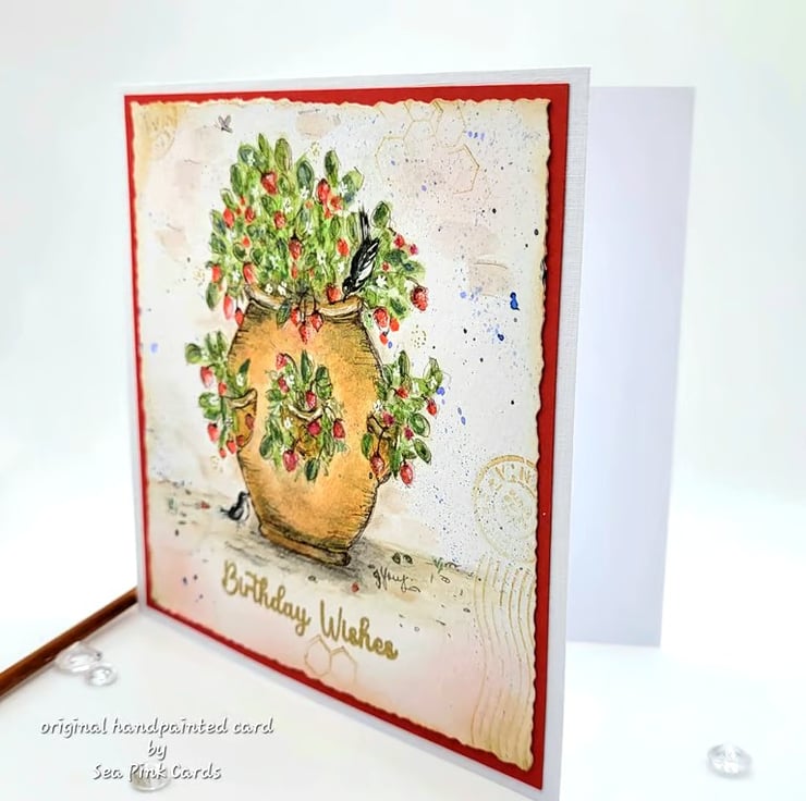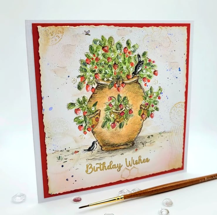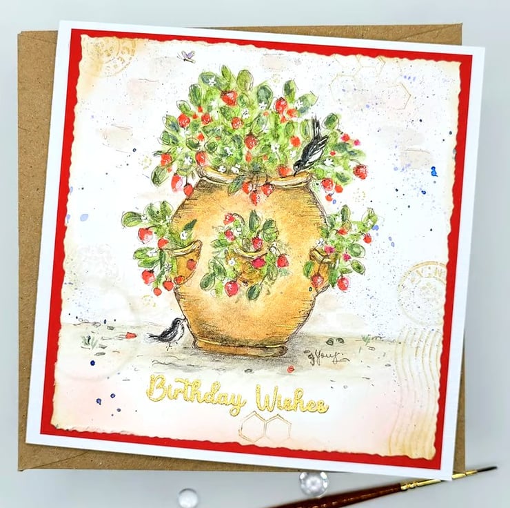 An original Birthday Card that has been sketched and watercoloured with lots of detail. Not pre-printed, it is a one-of-a-kind birthday card that has been individually handcrafted. The design is of a strawberry planter that's just too much for a couple of little birds to resist! It's blank white inside, for writing your own greeting. There is a small sentiment stamped by hand in gold on the front.