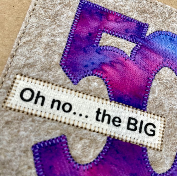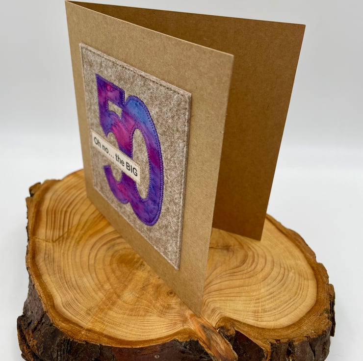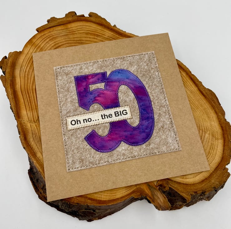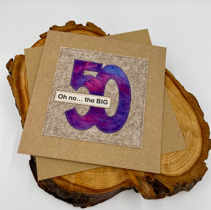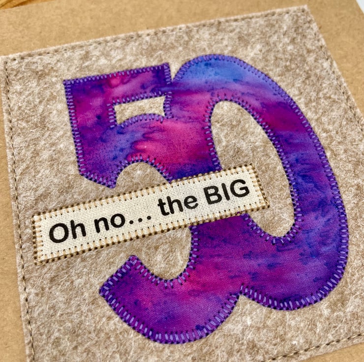A milestone moment deserves a card with a little extra charm! This fun appliqué design features a bold ‘5 0’ stitched from cheerful fabric, with the playful message ‘Oh no… the BIG’ lovingly embroidered onto soft beige felt. Set against a recycled card for an eco-friendly touch, this handmade keepsake is perfect for celebrating the big 5-0 with a smile. Whether it’s for a friend or family member, this card is sure to bring a chuckle and a whole lot of birthday cheer!