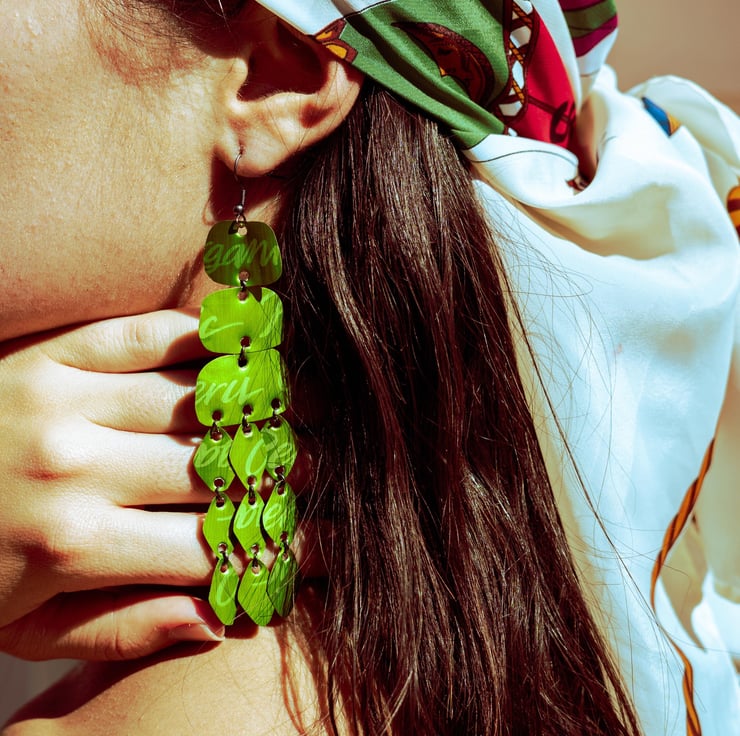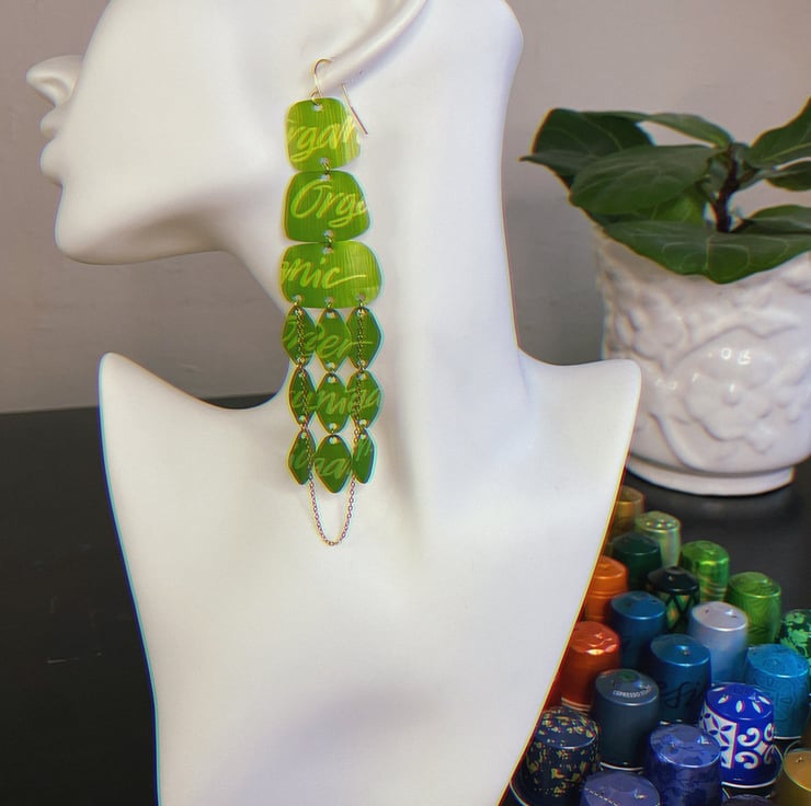 Elevate your look with these eco-chic chandelier earrings, crafted from upcycled bright green Nespresso capsules. Each capsule features a subtle, intricate pattern, merging elegance with sustainability for a one-of-a-kind addition to your jewellery collection.