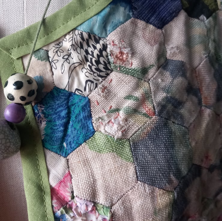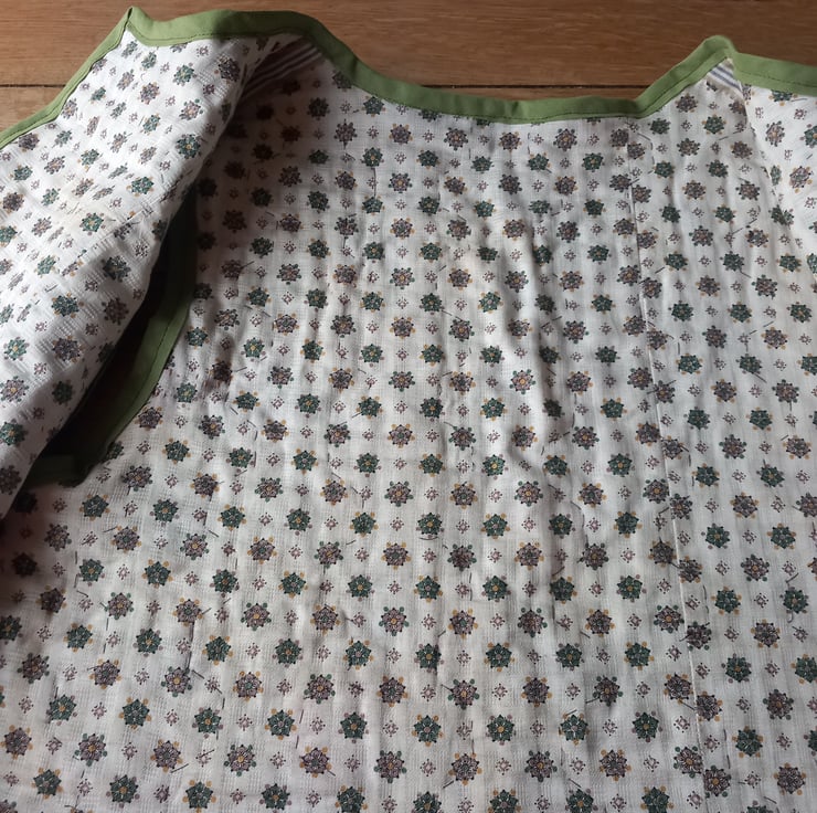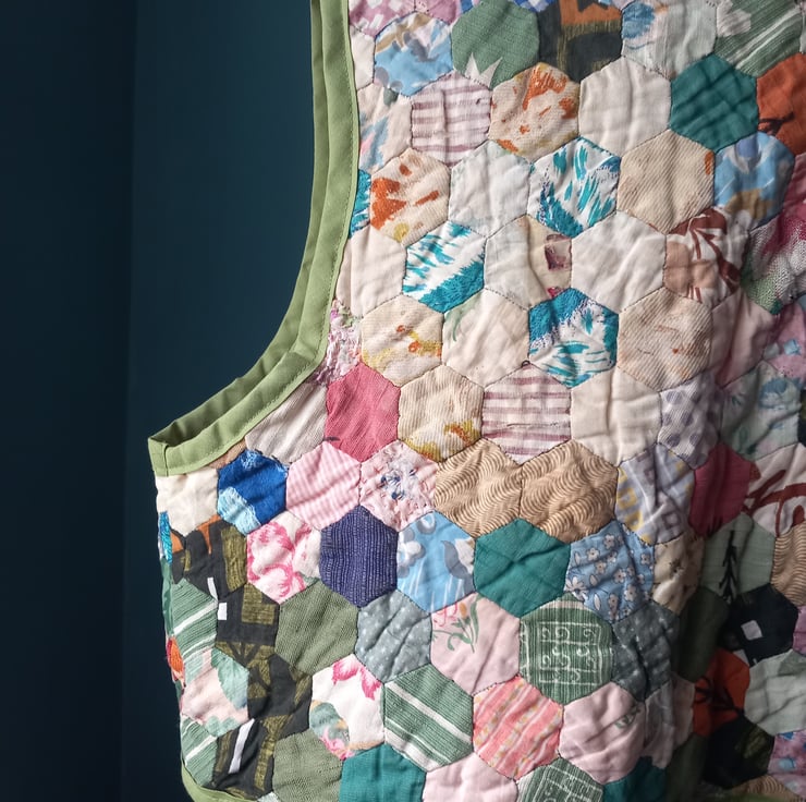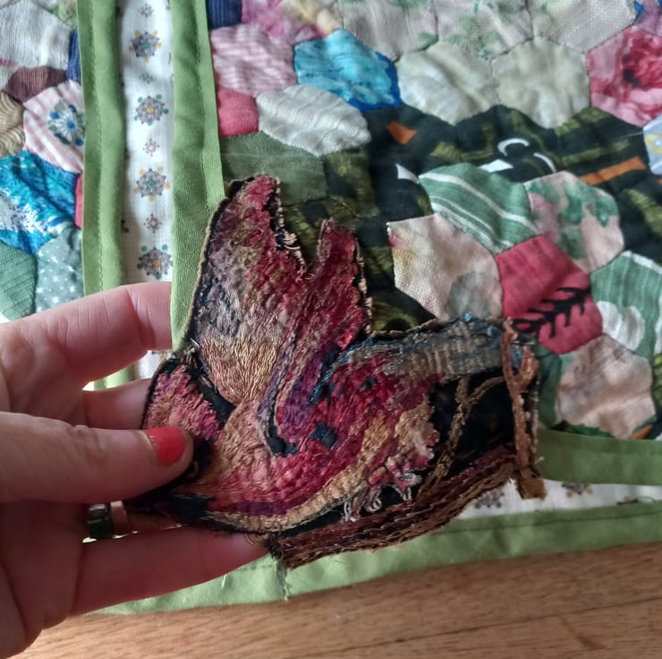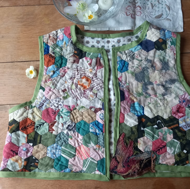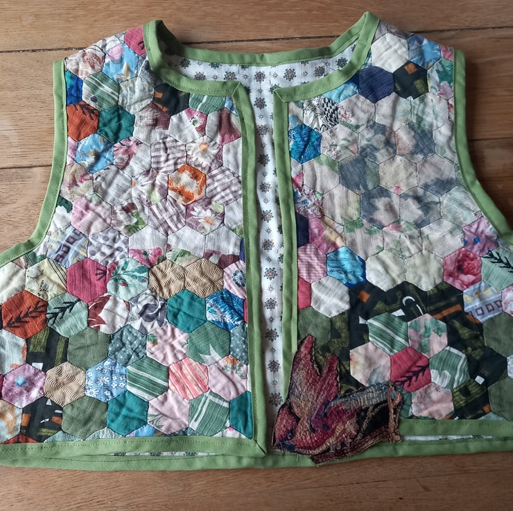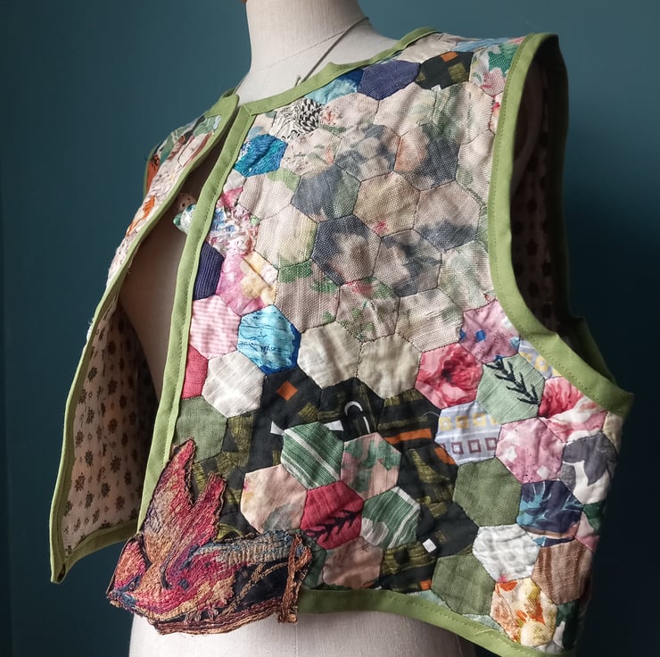 This vintage packwork jacket is beautiful, quirky and full of character, I have slow stitched areas of packwork that are worn. For a lover of textiles wirh added vintage bird. I have slow stitched any worn areas. It's adorable