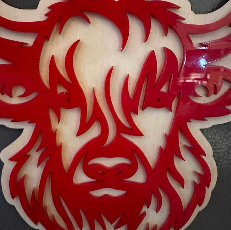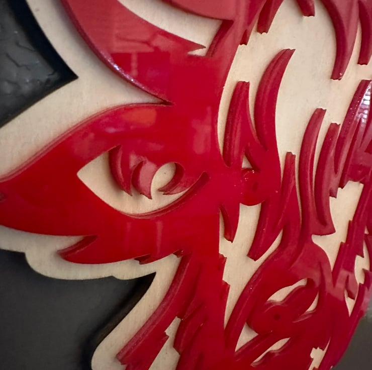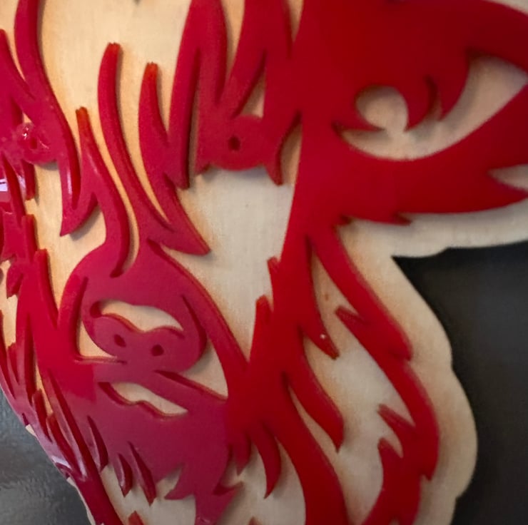 This piece is a 2 layer piece of wall/fridge art.The item is approx 18 x 21cm and is made from laser cut plywood and red acrylic. The layers are 3mm in depth giving the item at 3d effect. Comes with magnets on the back but could also be wall mounted and displayed in other ways.