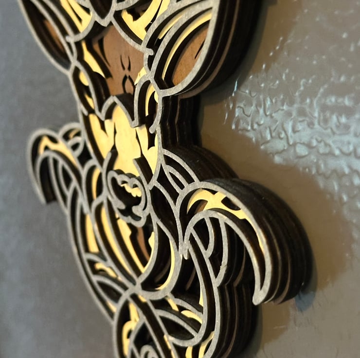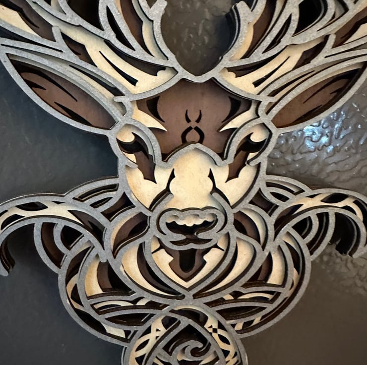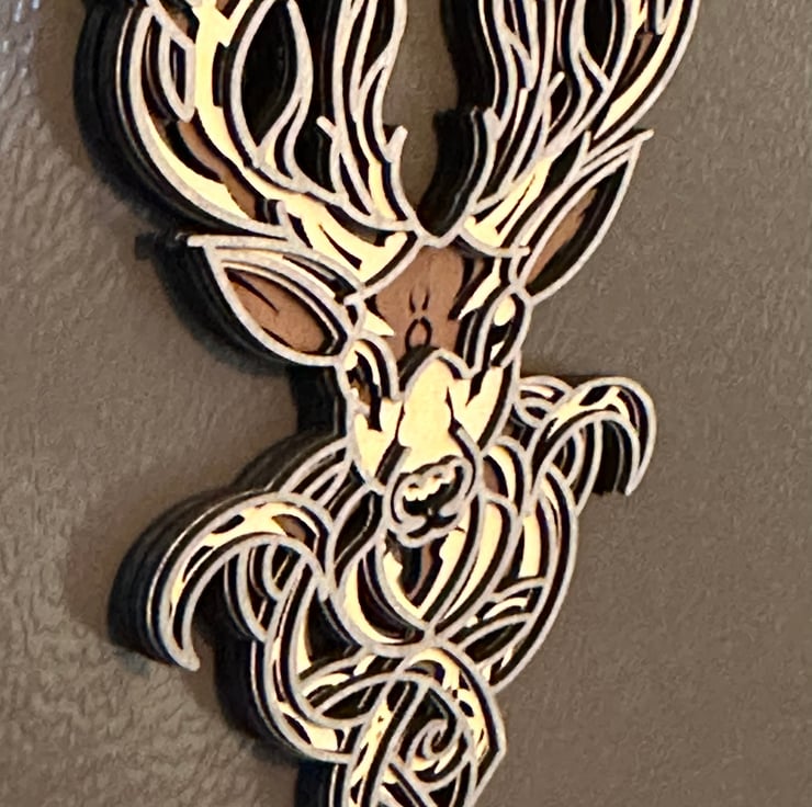 This is a scottish stag layered art piece or fridge magnet. Measurng 11 x 17cm it is made from 1.5mm plywood featuring 4 hand coloured layers to bring together this eye catching design. The item is approx 6mm deep. It comes with magnets attached to the rear but could easily be wall hung or displayed in many other ways.