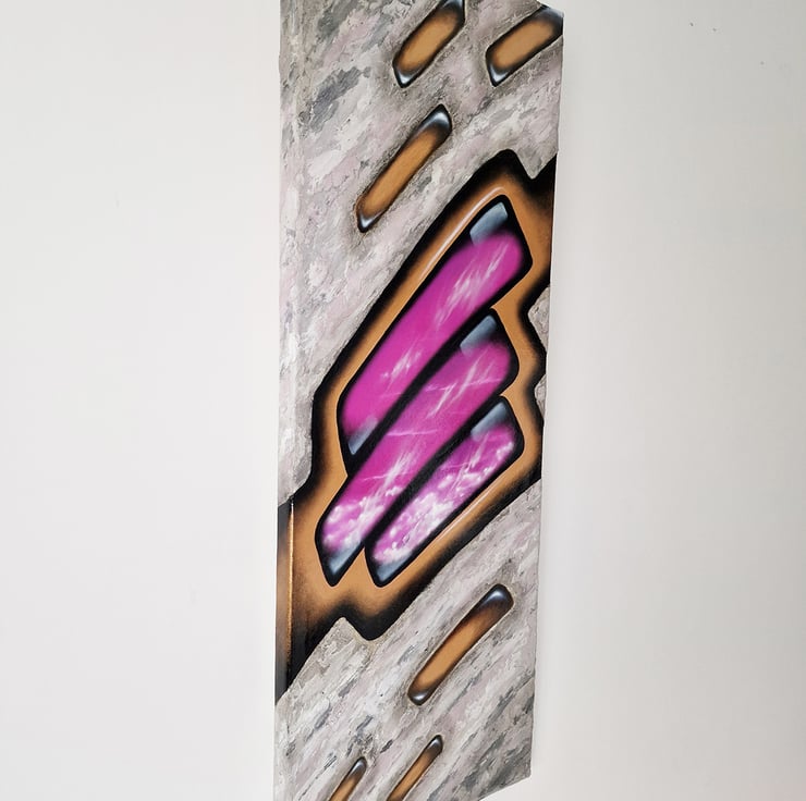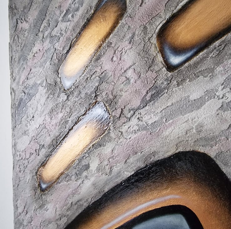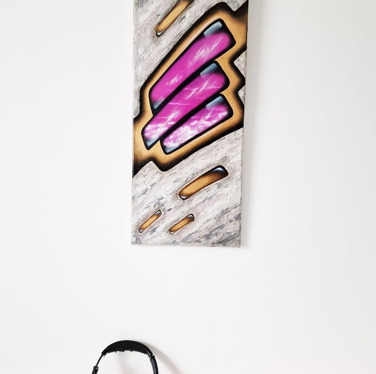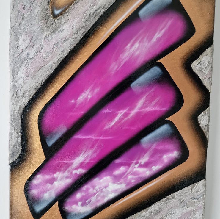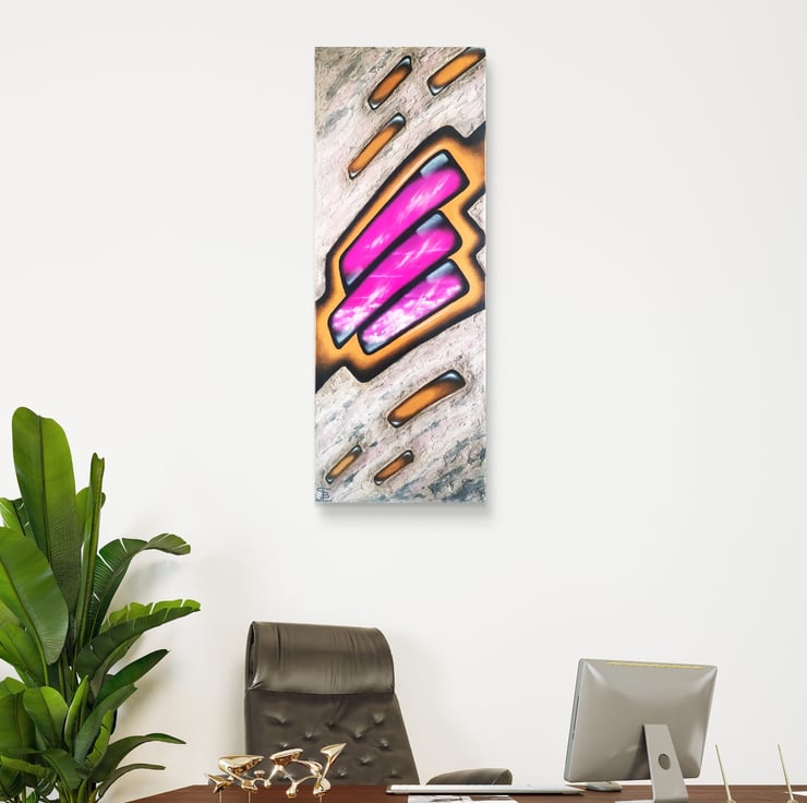 Jewellery for the wall, definitely it is. The golden framed pink sky is painted with oils, the surroundings resembles stone made with acrylics and sand. This very feminine artwork could be a pride of any office.