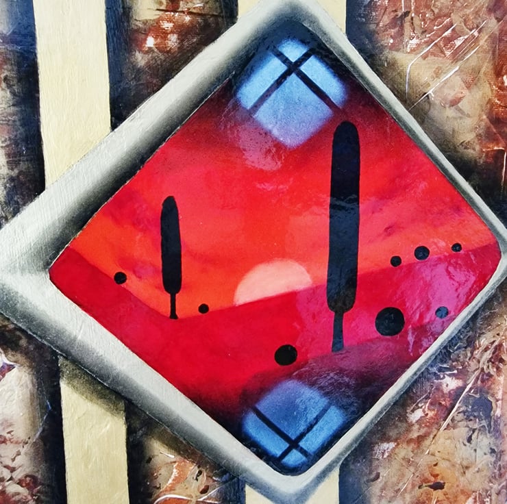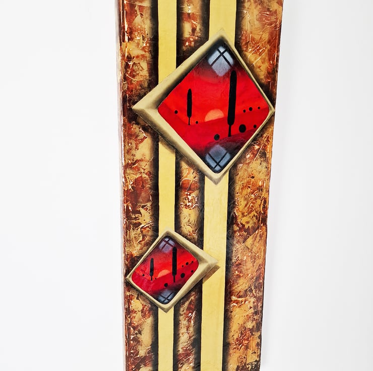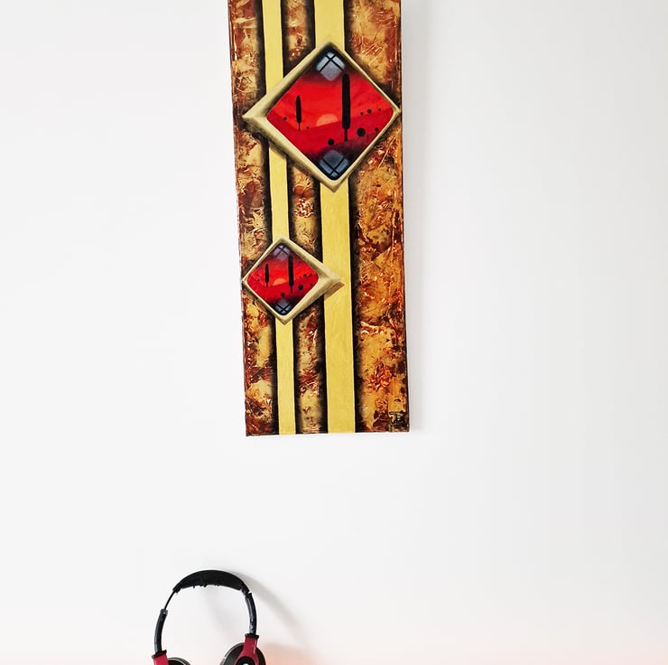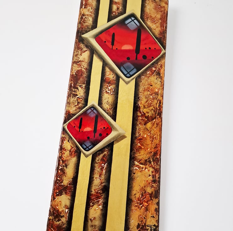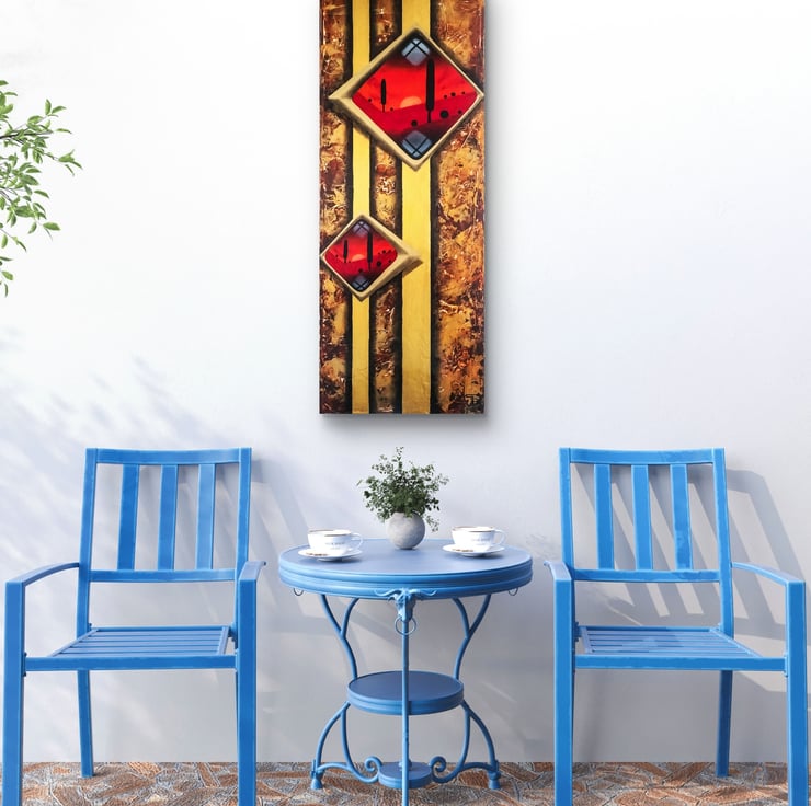 An elegant carmine-red minimalistic oil landscape is surrounded with gold acrylic abstract. Such an exceptional piece of art which calls back the good times of art deco.