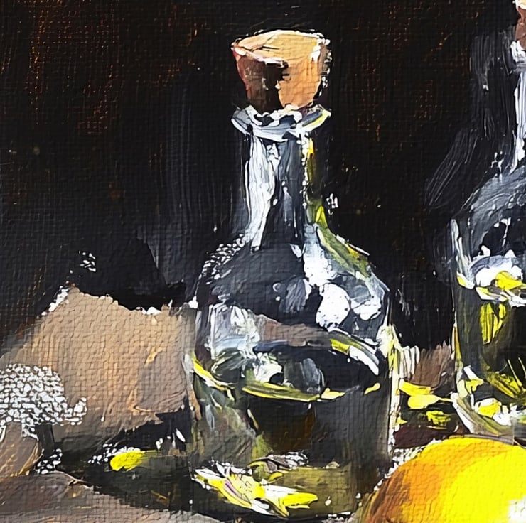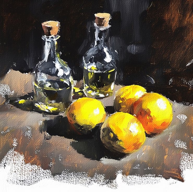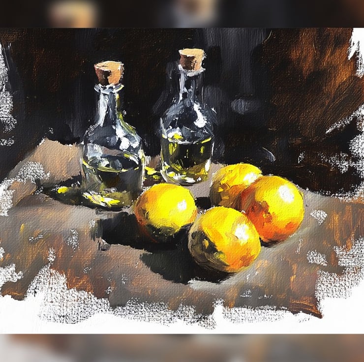 With bold impasto brushstrokes and a dark background, the artist creates a dramatic and intimate feeling. The reflections on the glass bottles add another layer of detail, drawing the eye to the fine craftsmanship. Meanwhile, the bright yellow lemons stand out beautifully against the dark backdrop, symbolizing freshness and energy.