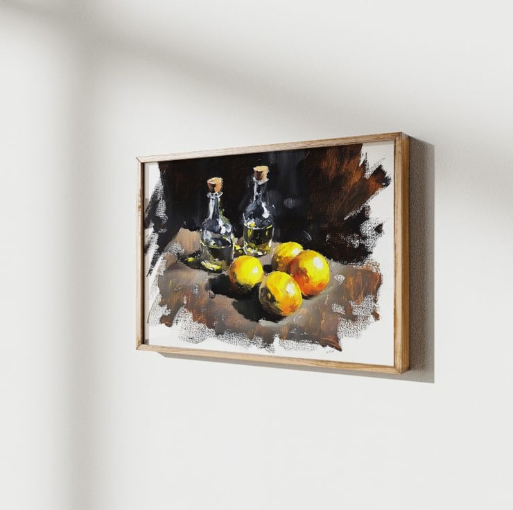 This Still Life Oil Painting captures the timeless beauty of classic still life art. It features golden lemons and reflective glass bottles, painted with rich textures and deep contrasts. Warm earthy tones bring the scene to life, while light and shadow add depth, making the objects look real.