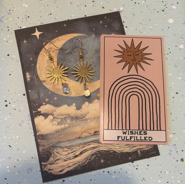 Brushed gold coloured sun charms with delicate water glass droplets.
