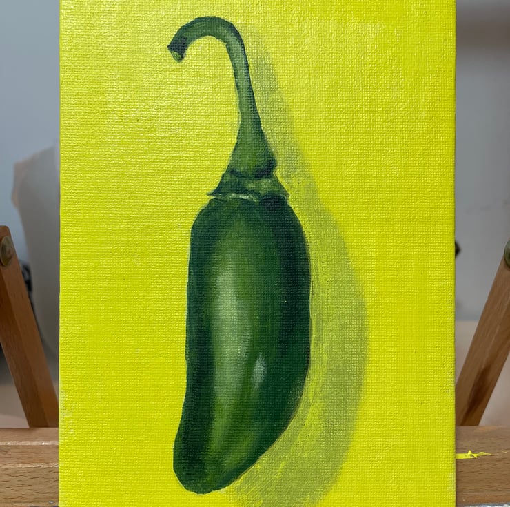 This is part of a series of small paintings with simple subjects, bright colours and vibrant backgrounds