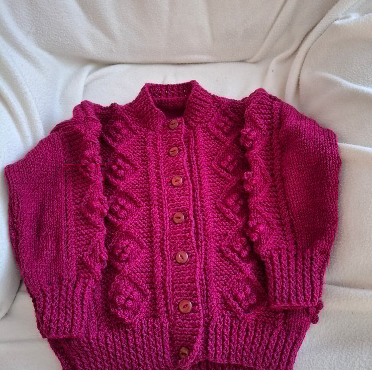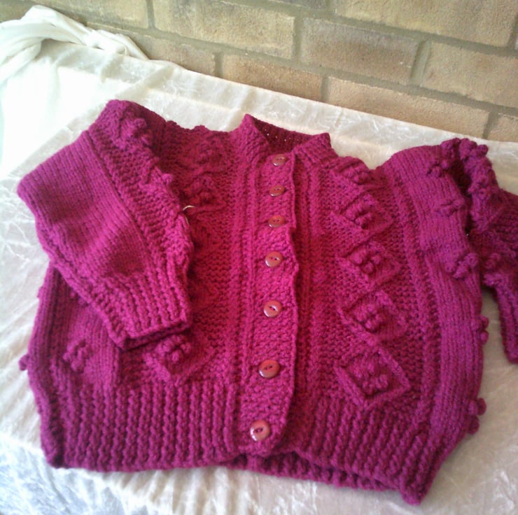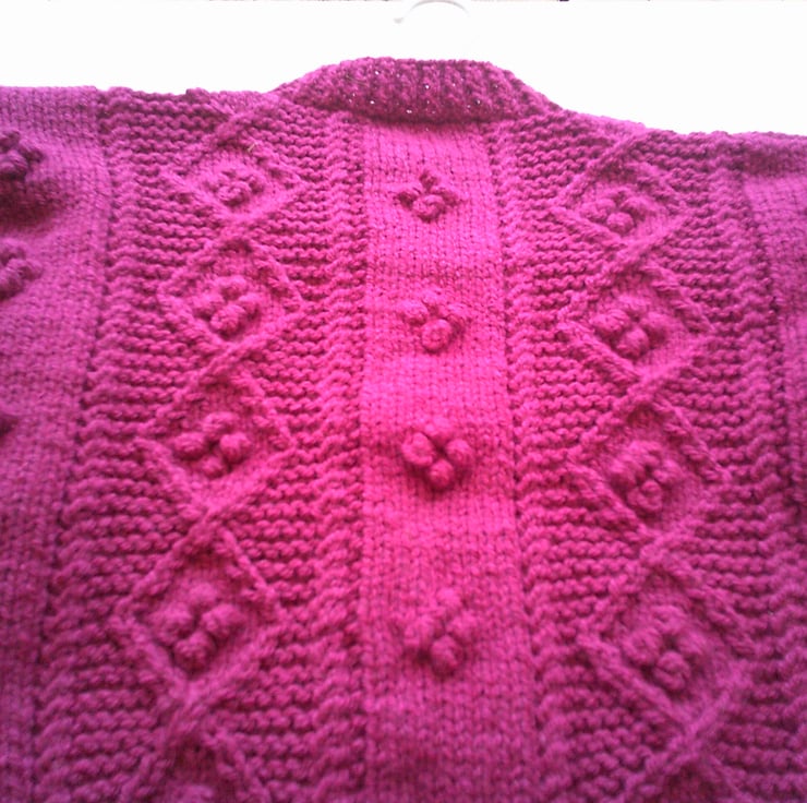 This hand knitted round neck Aran cardigan has a design of bobbles in diamonds on a garter stitch surround with stocking stitch and bobbles on the fronts and back. It would make an ideal addition to a child's wardrobe as it can be used over a T shirt with Jeans, trousers or skirt when the weather is a bit warmer and there is no need for a coat. .