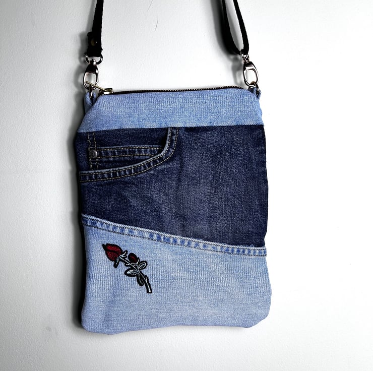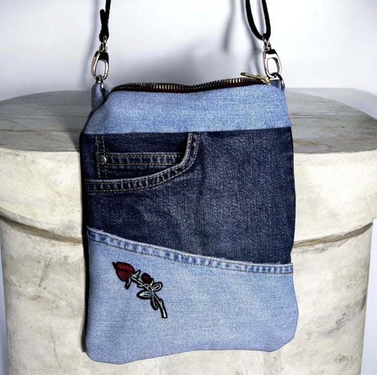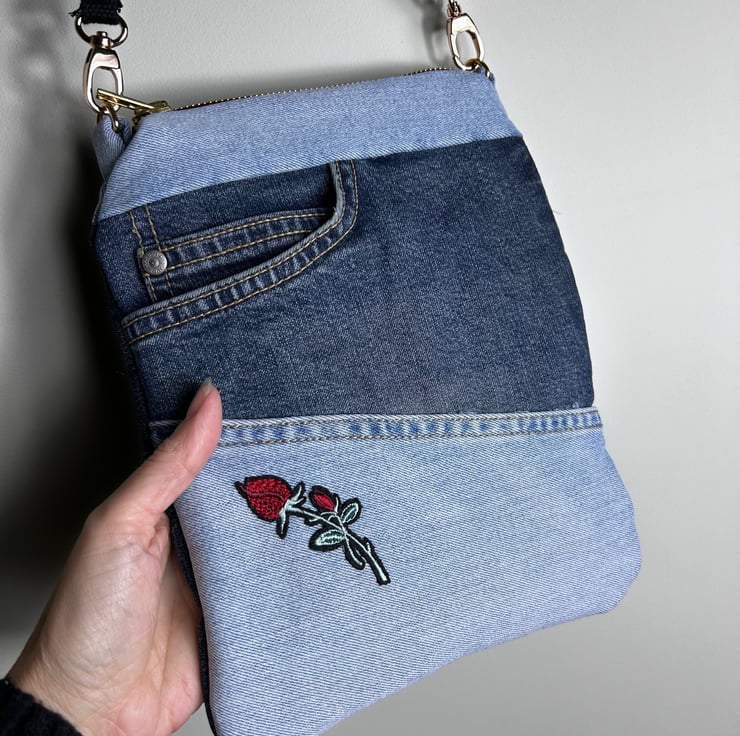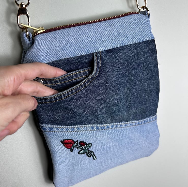 Fun upcycled denim bag incorporating a pocket from jeans into the design,