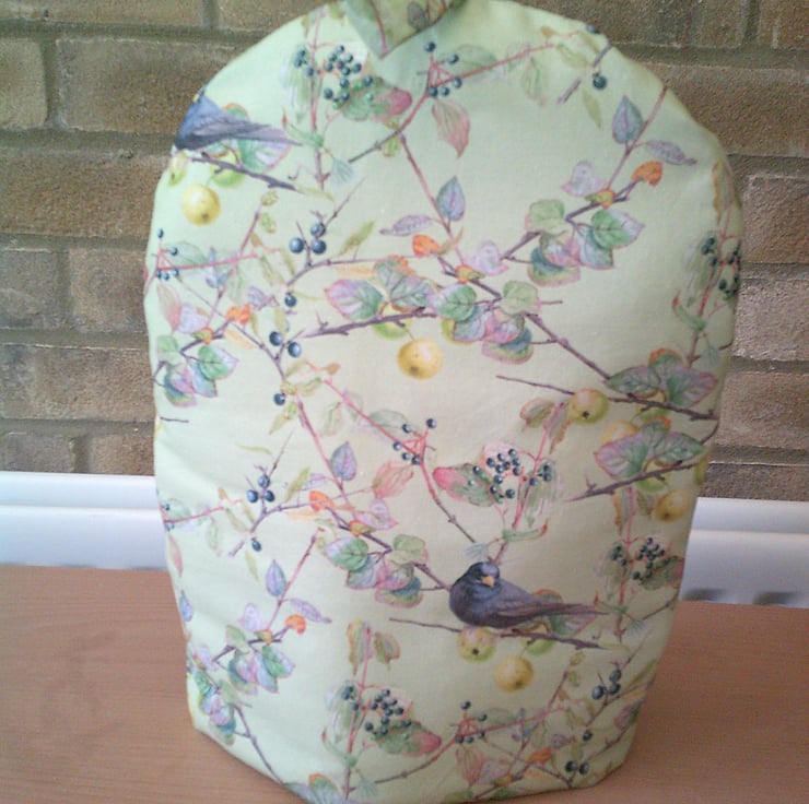 The design of the fabric used is of Garden Birds, Apples and berries on a Green background.