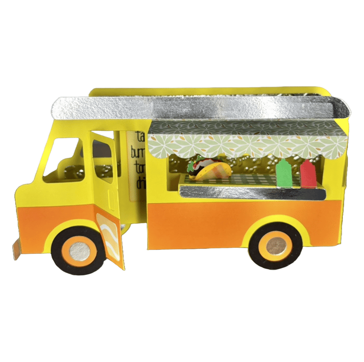 This delightful Taco Van Pop-Up Card, from our previous year's collection, is looking for a new home with someone who loves fast food. With its vibrant colors and playful design, this card perfectly captures the joy of a bustling taco stand. Ideal for anyone who enjoys a fun and creative greeting card, it's sure to bring a smile to their face and remind them of their favorite street food adventures.