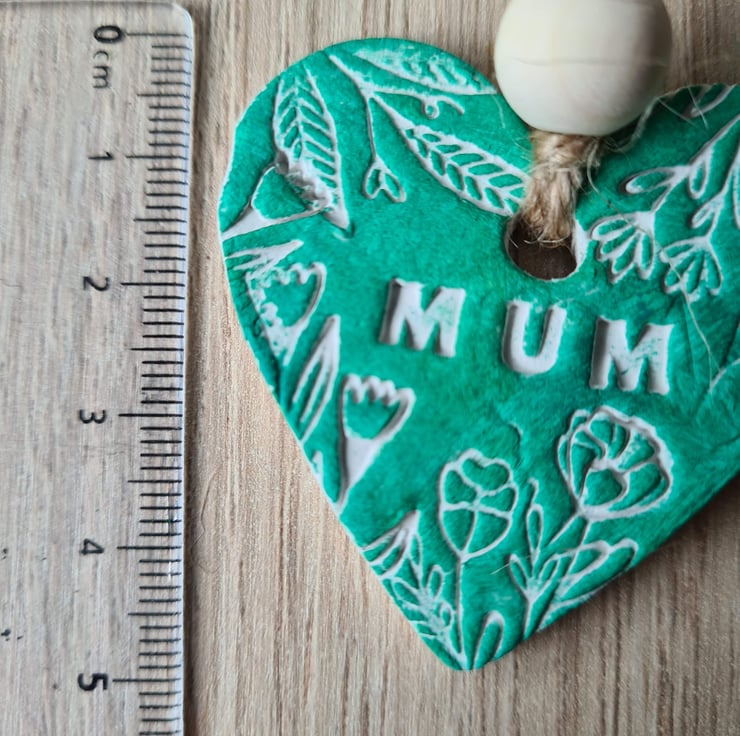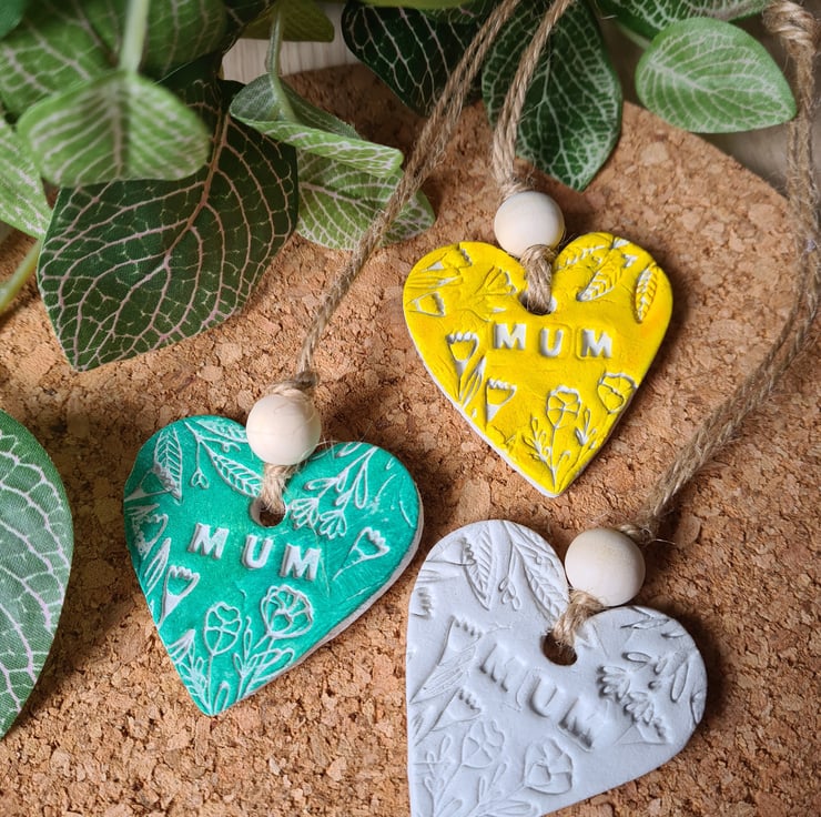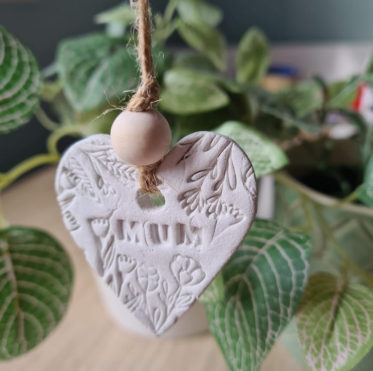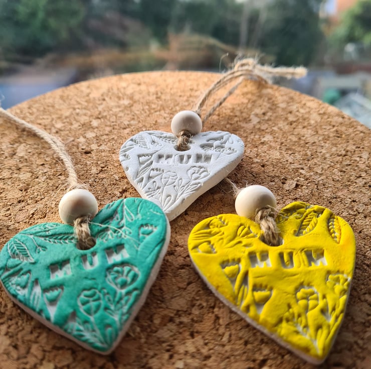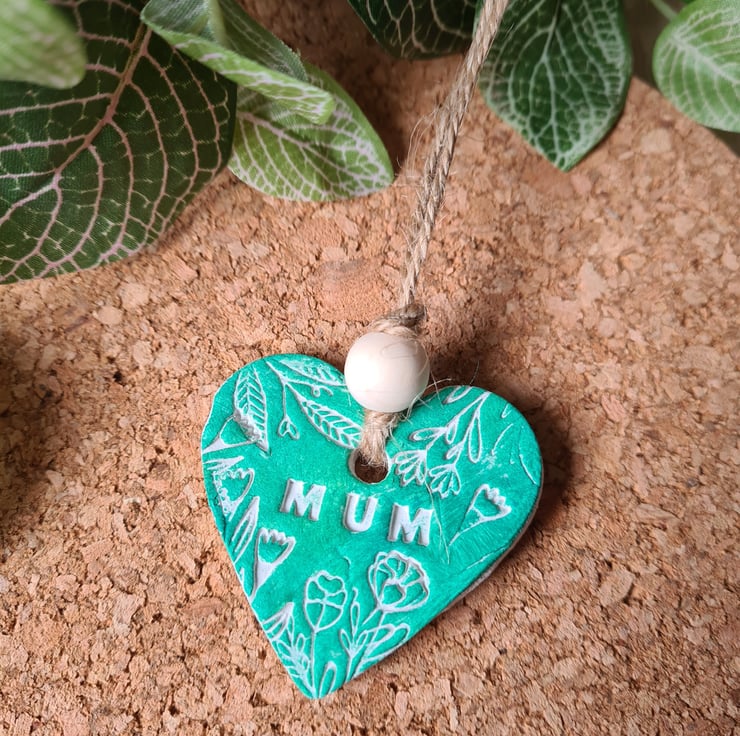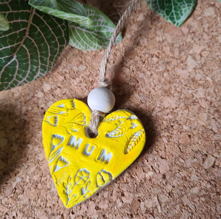 Available in white, yellow or green, this pretty heart shaped hanging decoration is made from air-drying clay embossed with a pretty design and the word 'mum'. Once dry, I handpainted it then varnished one side with matte varnish and added string and bead to finish. The back has been left unsealed to write on, so the recipient can have a lasting message and keepsake from a loved one. If you'd like it in another colour, please get in touch. This may take a few days if I have to make a new one, as the clay takes 2-3 days to dry.