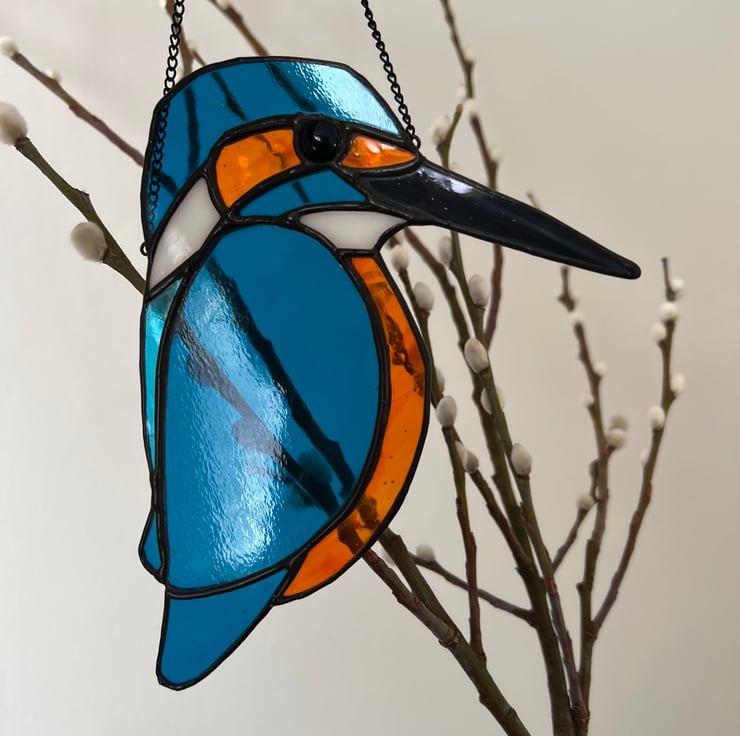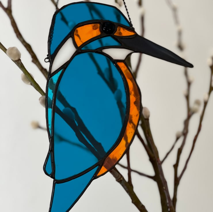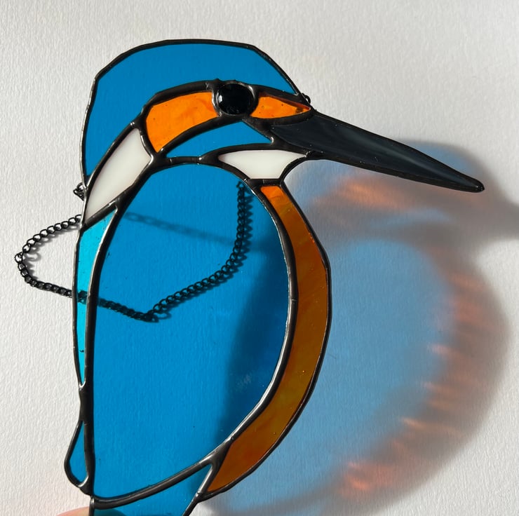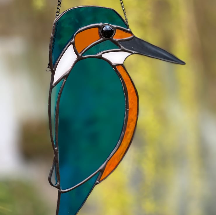 A stained glass kingfisher that would be a striking addition to any window. Rich colours in beautifully smooth transparent glass are perfect to represent this stunning bird. Just wait for the sun to shine through to see the wonderful light it casts.
