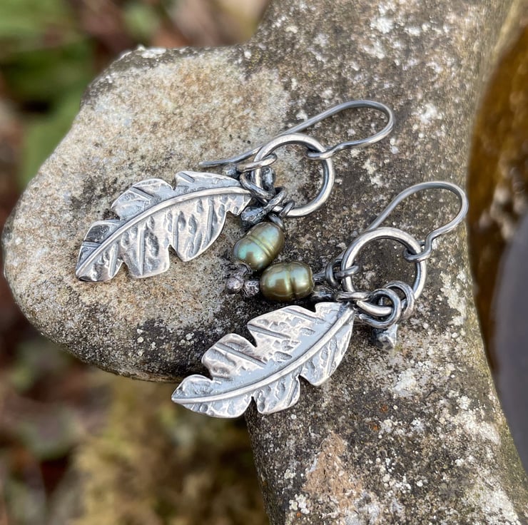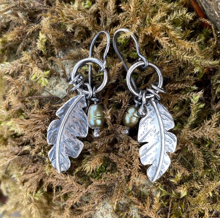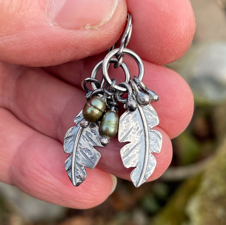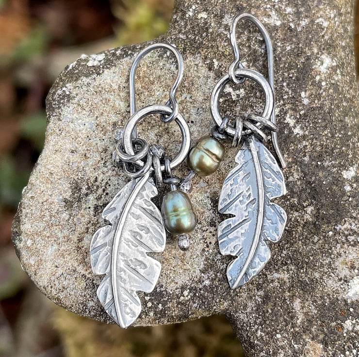 Silver and pearl earrings. Small handmade silver feathers sit below a ring that has little bobble charms and a wire wrapped mossy bronzy green pearl dangles.