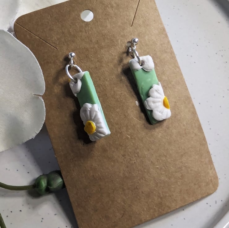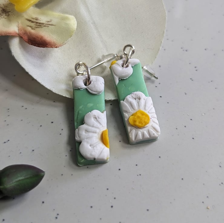 Part of Folksy's "perfectly imperfect" weekend! Rectangular green polymer clay earrings with white and yellow daisies. Made from FIMO polymer clay and stainless steel studs. Not perfect, but still cute!