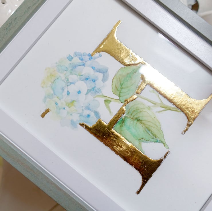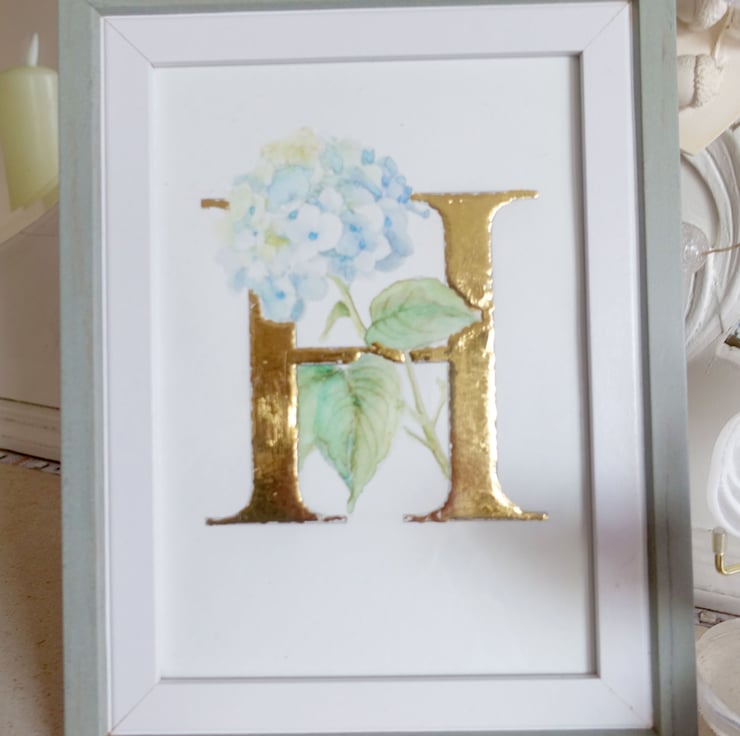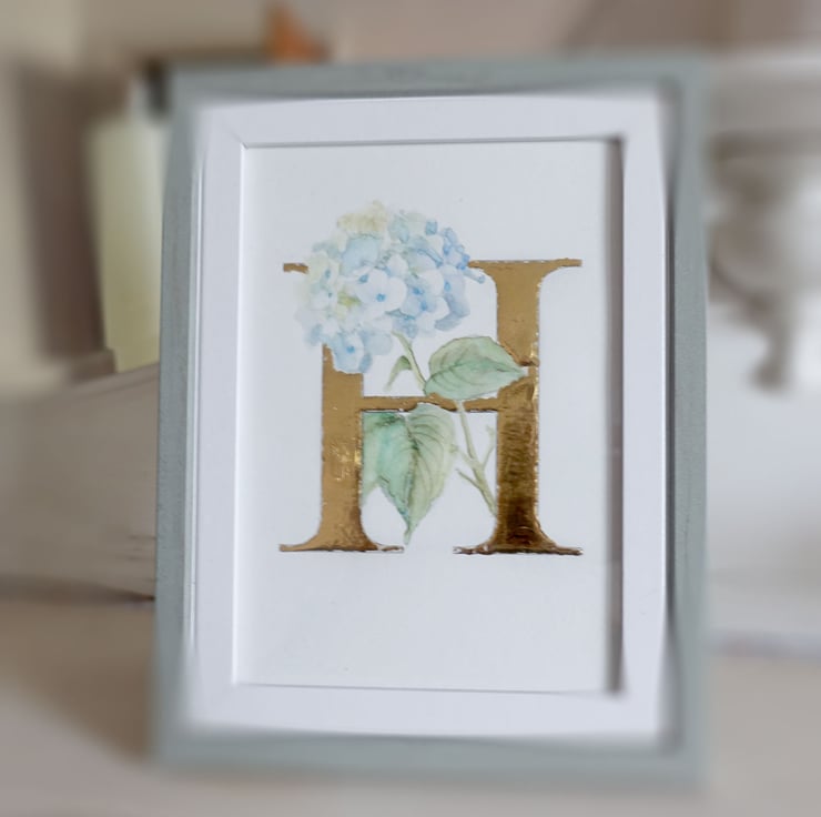 Original watercolour art on 300gsm paper. Blue hydrangea entwined with a 23.5 carat gold H letter.