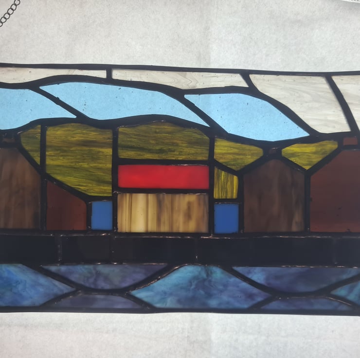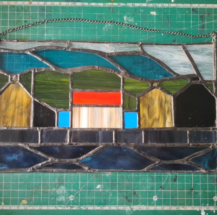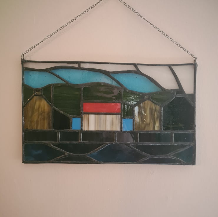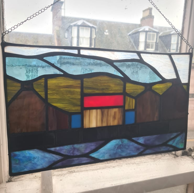 This panel is inspired by the coastal scottish town of Gardenstown. Where you open your front room directly onto the North Sea! Hand crafted using the Tiffany method it is delicate to look at but made to last and will enchant you for years to come. Measuring 17x23cm approximately it include a hanging chain and strong adhesive hanger
