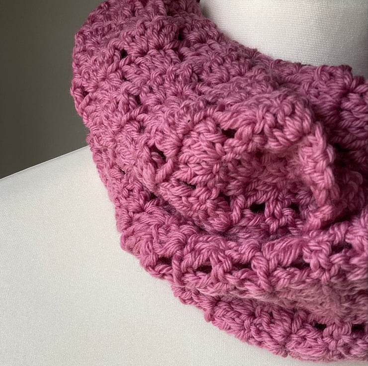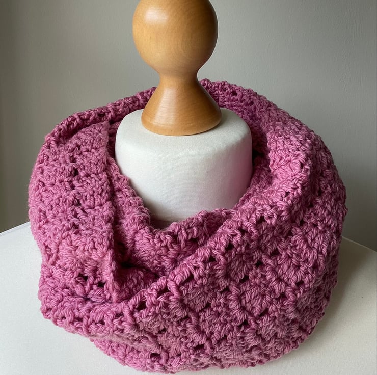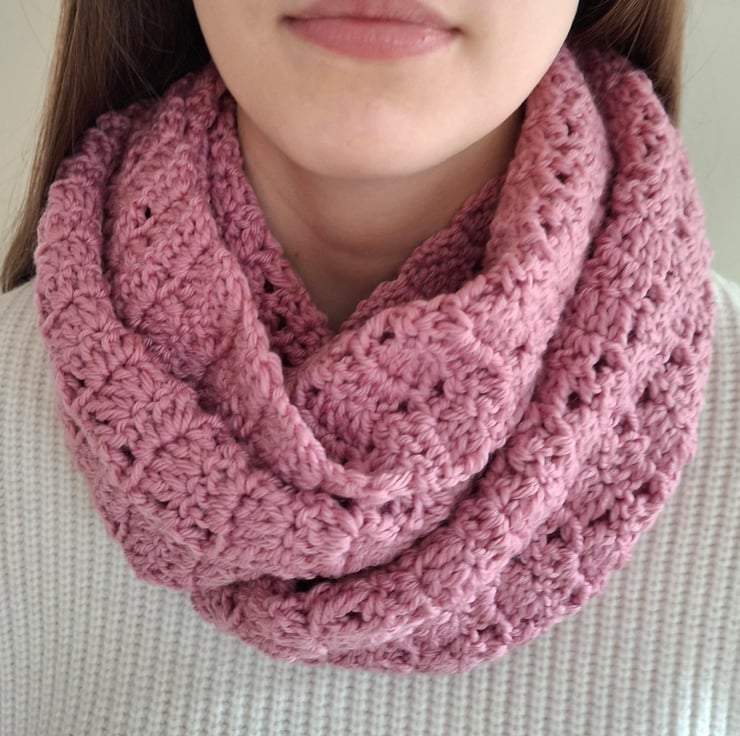 Lacy infinity scarves are crocheted in 4ply yarn.