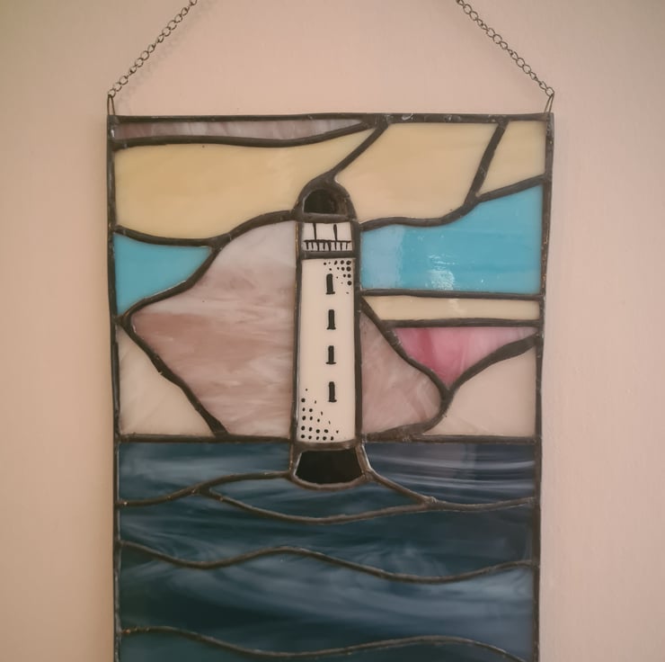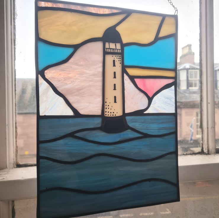 This piece is inspired by the bell rock light house on the angus coast! The moody colour of the sea next to the bold colourful skyline really captures the eye and makes a beautiful addition to your home. Hand crafted using the Tiffany method it is delicate to look at but made to last and will enchant you for years to come. Measuring 21x29cm approximately it includes a hanging chain and strong adhesive hanger.