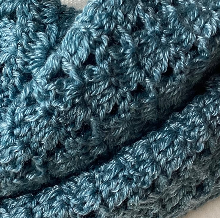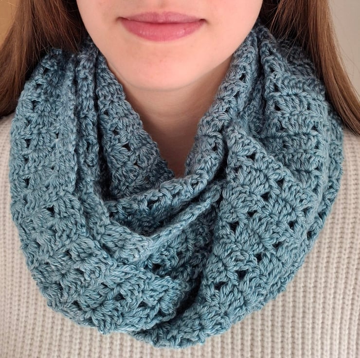 Lacy infinity scarves are crocheted in 4ply yarn.