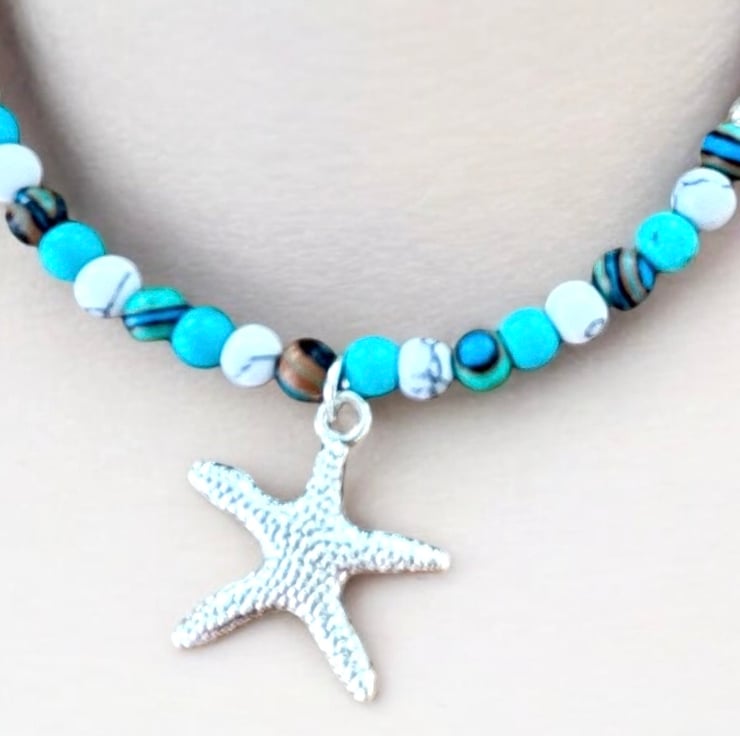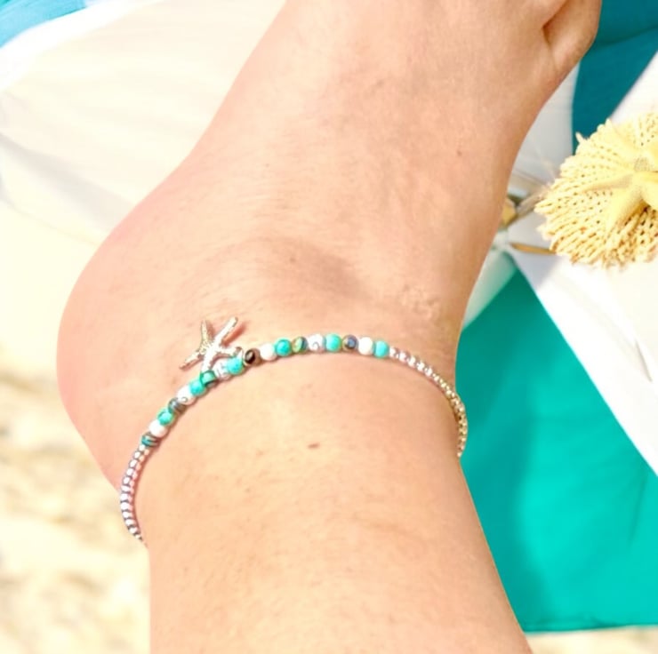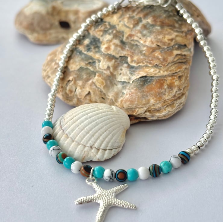Elevate your beach outfits with this dainty 9” anklet which has been handmade in West Yorkshire, I have used 3mm sterling Silver round beads, accented with 4mm Turquoise & White Howlite and Lake blue striped stone beads, embellished with a silver plated copper starfish charm and fastens with a lobster clasp. Will come in a pretty gift pouch,