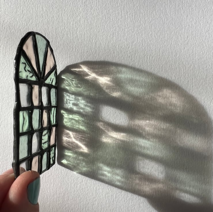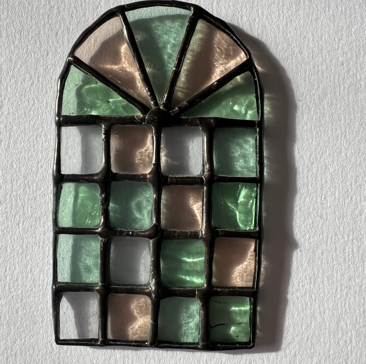 A delicate pastel miniature stained glass window made from vintage glass for use on any type of miniature home or dolls house. Pretty and delicate, this pink, clear and aqua window casts sparkling light refractions due to the subtle texture of the glass. The inclusion of vintage glass samples means that this is one of a kind - it isn’t possible for me to make another the same as this!