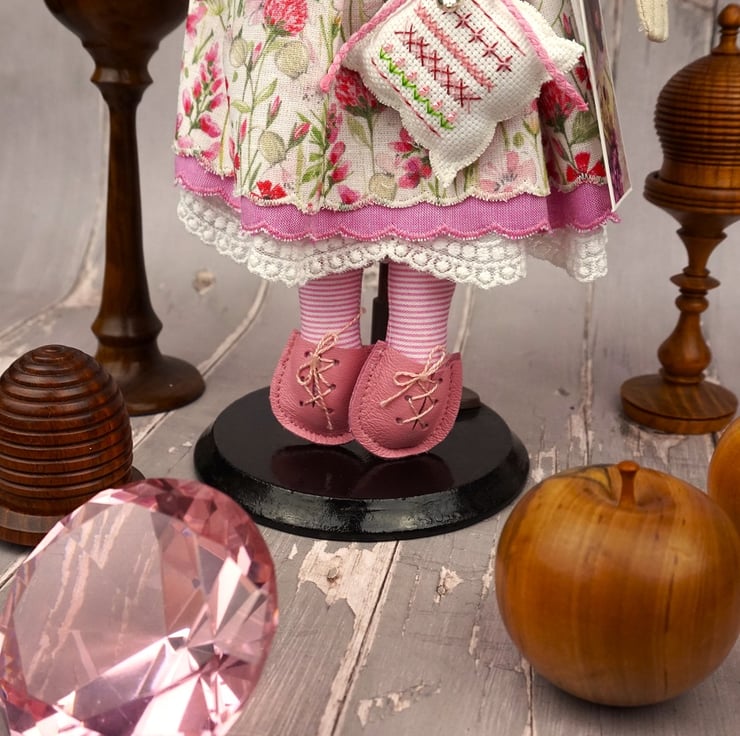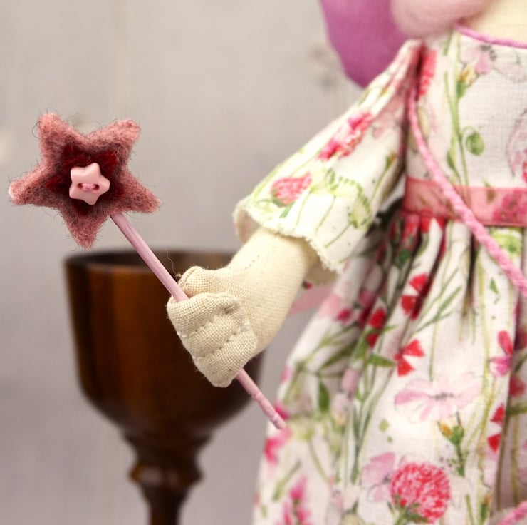 A smaller pattern, she is about two thirds the size of my witch. This little Fairy God Mother has an Acufactum print dress with a white ground and a summer meadow scene. Clover runs amok.. She has wings that match her underskirt and sports a little felt wand. Her shoes are the smallest I have ever made and are leather. She has a piece of rose quartz to her heart with rose petals flowers in her stuffing and is finished with tiny buttons, organza ribbon and a little coronet in her hair.