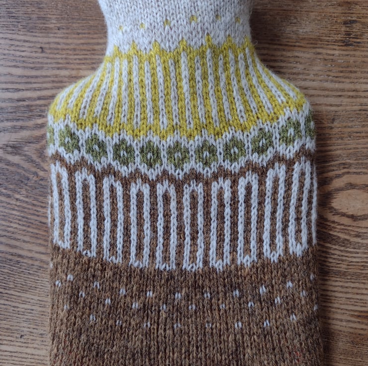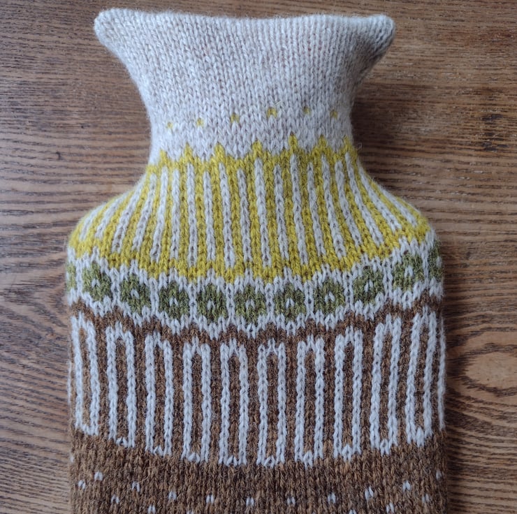 Knitted in Scotland using plant dyed yarn from our own flock, includes a 1 litre natural rubber bottle. The front features a Fair Isle style design, and the back is a light grey/beige with a pillow style opening.