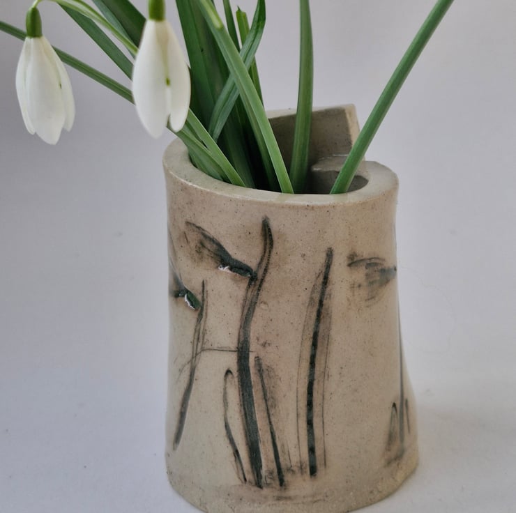 The vase is then fired to 1250', then bought to life using a green colour wash and oxide, delicately applied, settling into the textured surfaces and crevices, adding depth and richness.