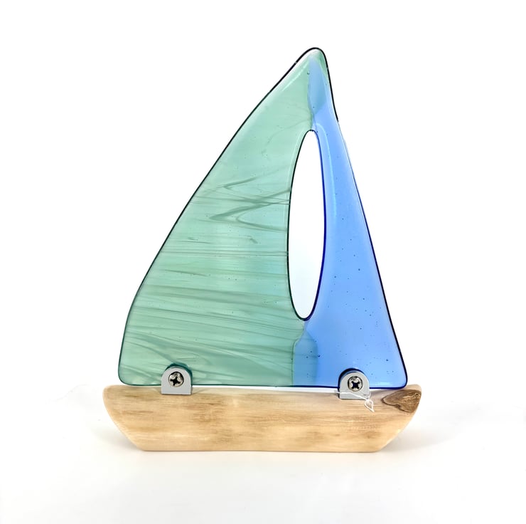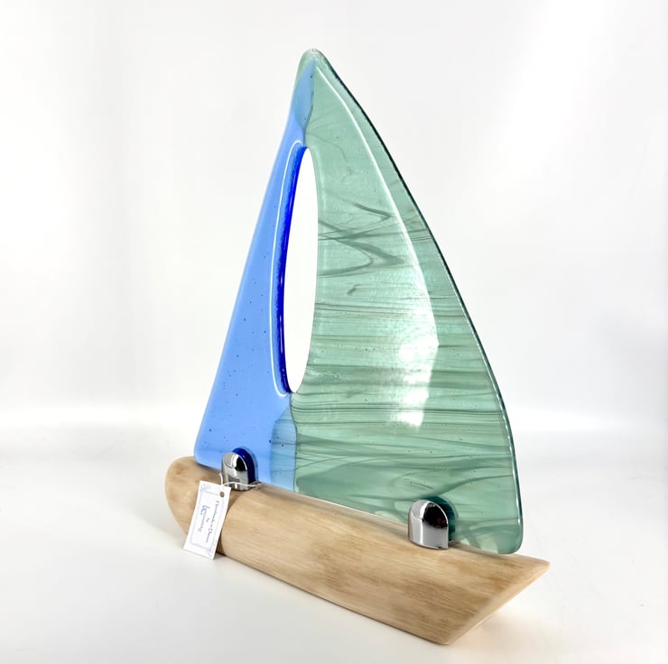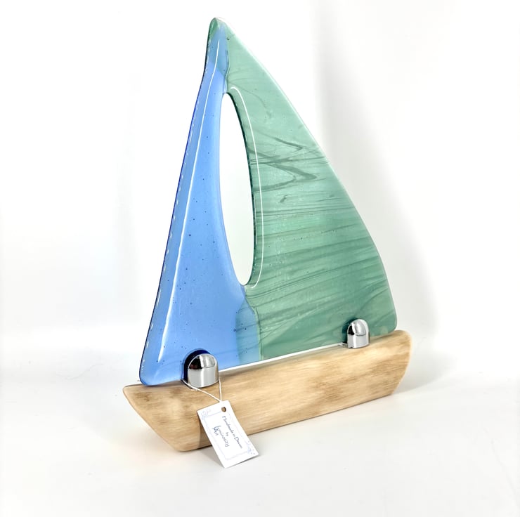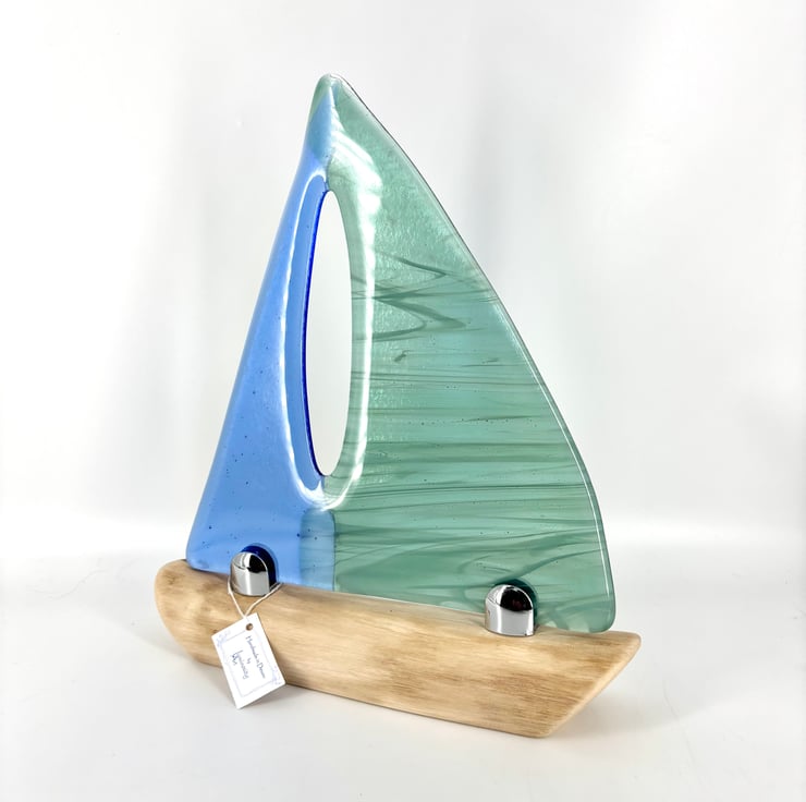 A gorgeous decorative sailing boat. Beautiful wispy sea green and pale blue fused glass sails set on a gorgeous piece of drift wood which had been washed up on the Devon coast.