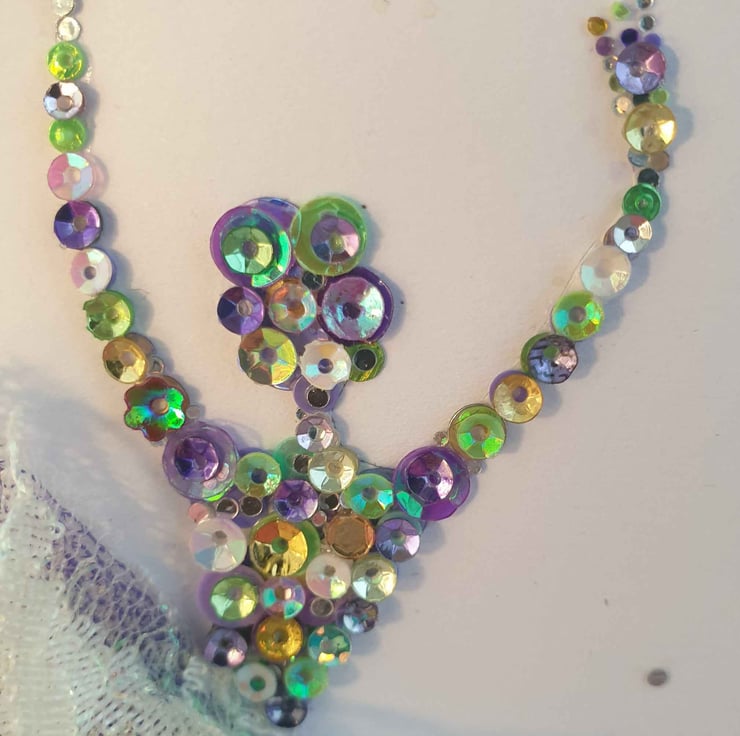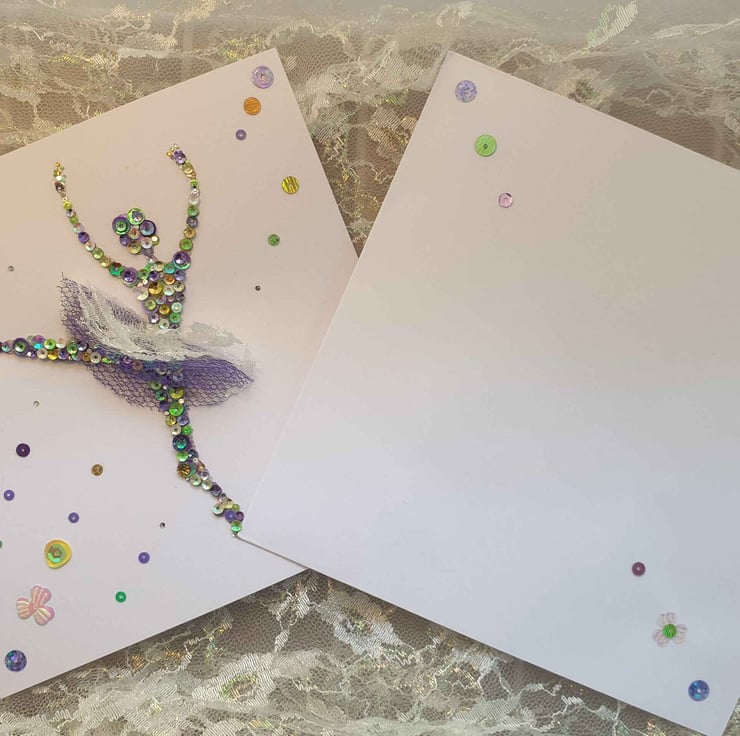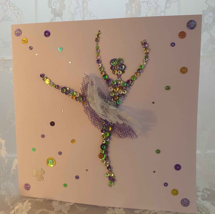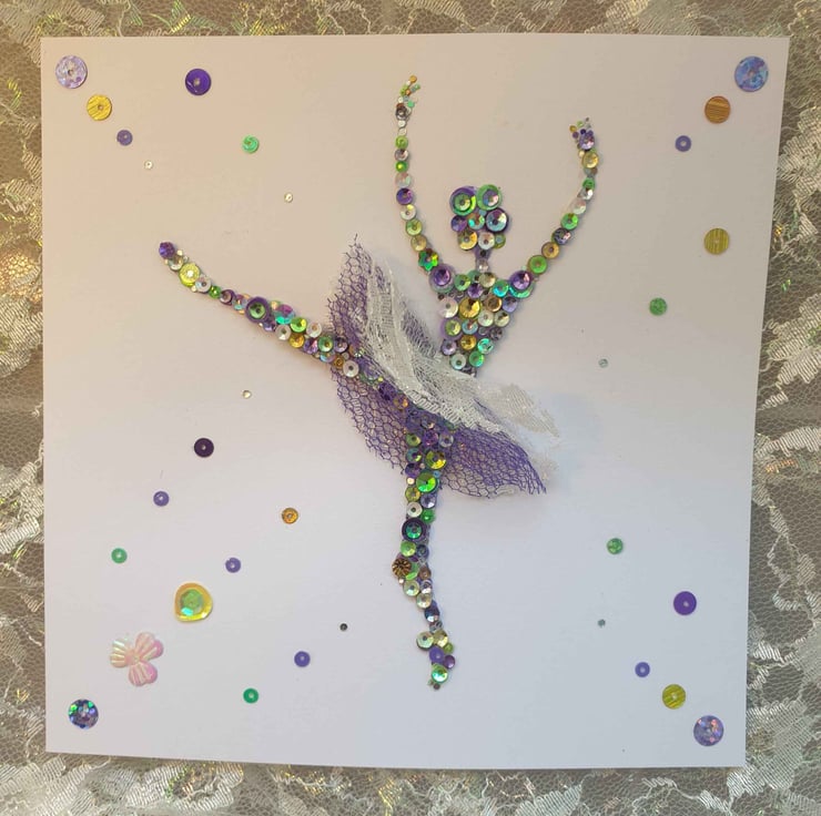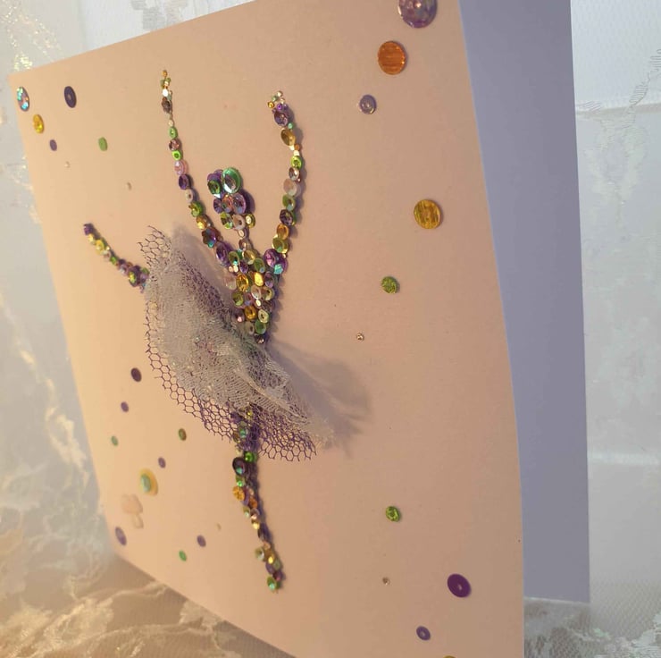 The dancer's lilac, cream, green and gold tutu creates a pretty 3D effect and is made from netting and lace. Each sequin is carefully glued and placed up to three layers deep, then varnished/lacquered to keep them looking their shiny best. One card takes a full day to complete.