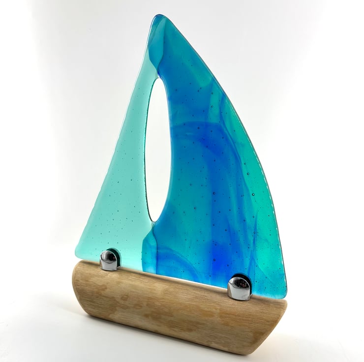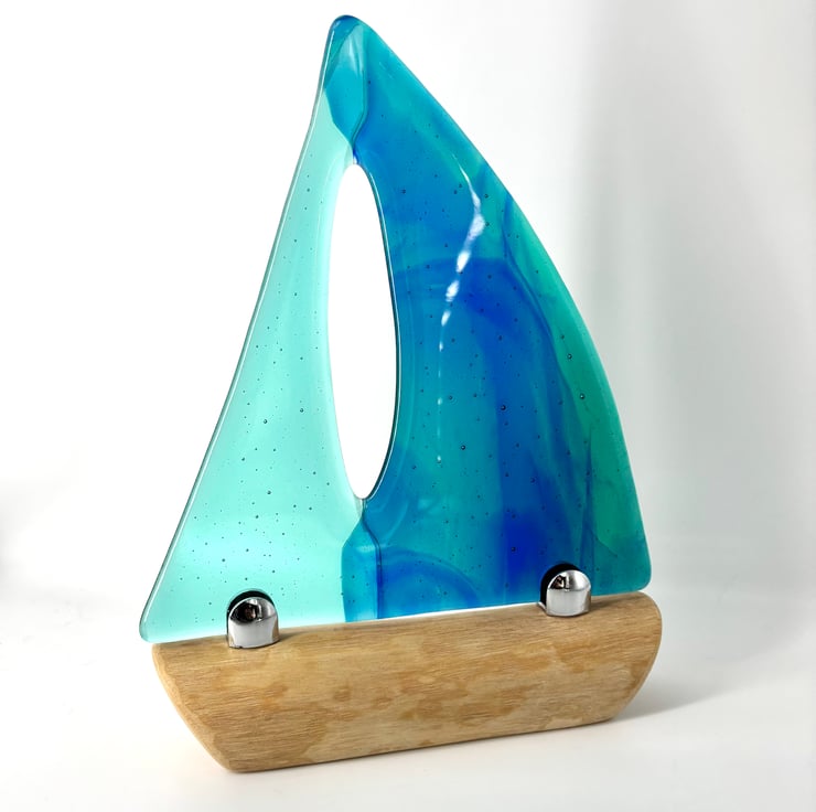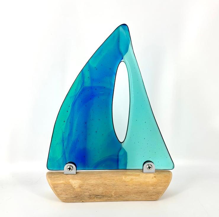 A gorgeous decorative sailing boat. Beautiful blue and emerald green wispy and pale teal fused glass sails set on a gorgeous piece of drift wood which had been washed up on the Devon coast.