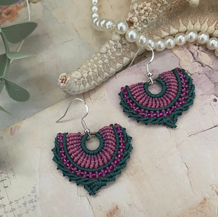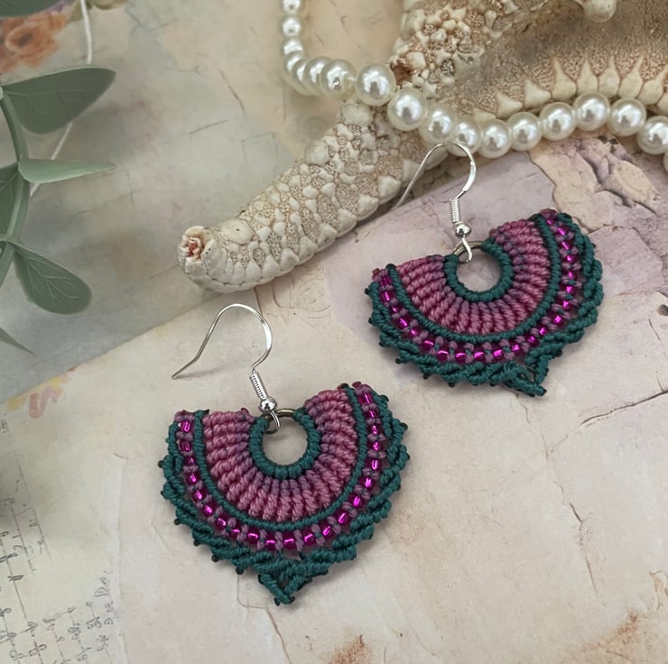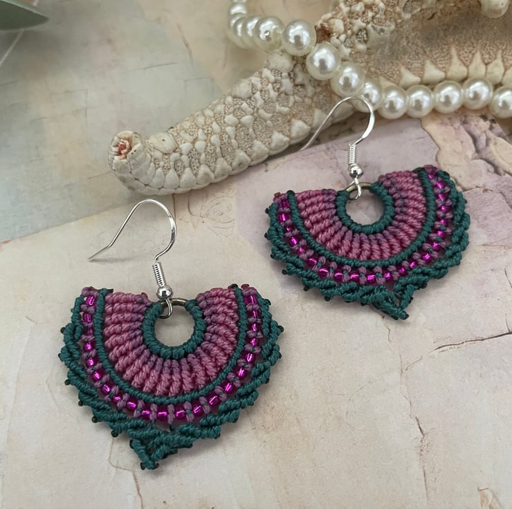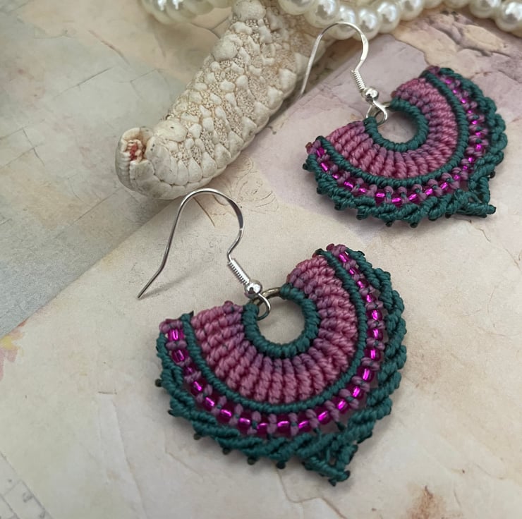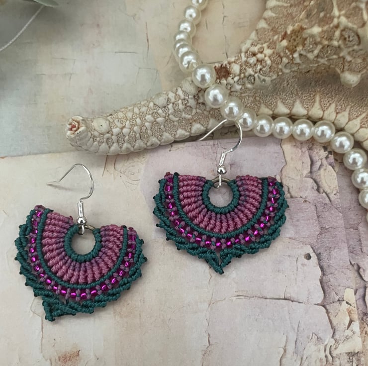 Designed and created by me in my Kent studio in pretty colours of lilac and pink interwoven with tiny glass seed beads and using unbreakable c-lon macrame thread which makes them very light weight but makes a big statement .