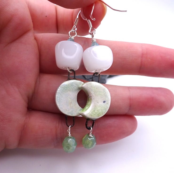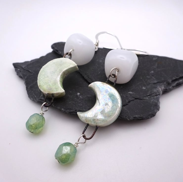 A pair of earrings made with sterling silver ear wires, blue crystals, handmade white lampwork glass nugget beads, handmade ceramic moon connectors and green Czech glass beads.