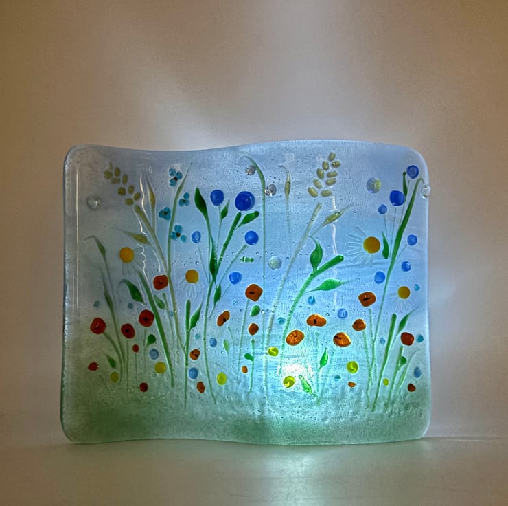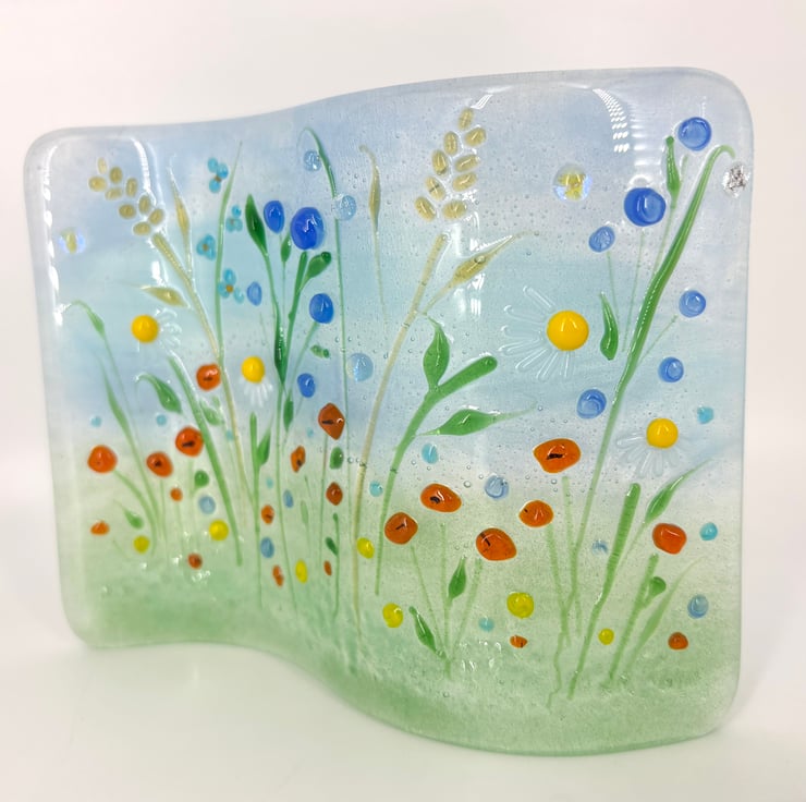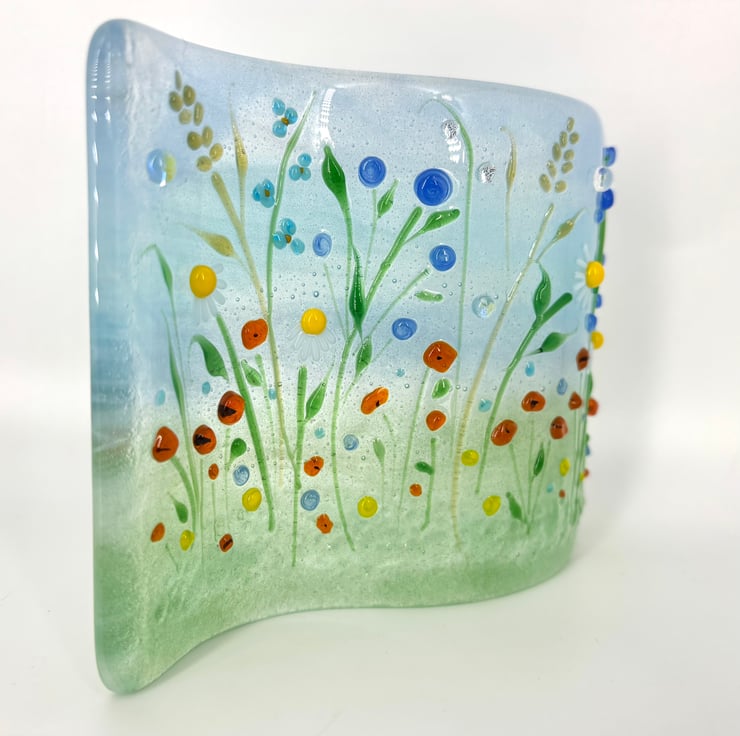 I've always been a stickler for detail which isn't always easy to achieve with fused glass. After many hours of 'playing' I created my meadows which are made up of tiny lamp worked flowers and foliage with gorgeous accents of sparkle from dichroic glass. The result is ethereal - delicate, feminine and quite positively dreamy!