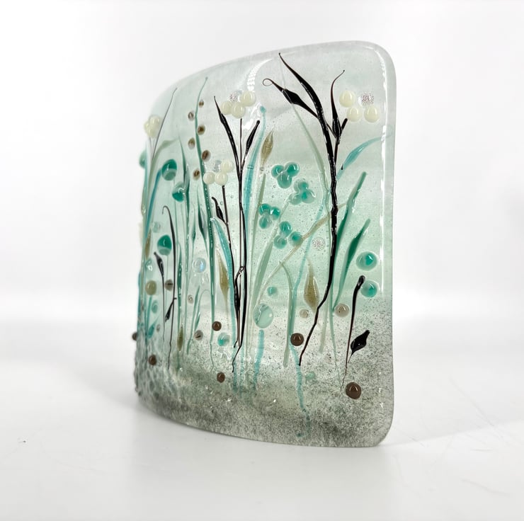 A pretty, free standing glass curve in soft teal green, black and bronze delicate wild flowers.