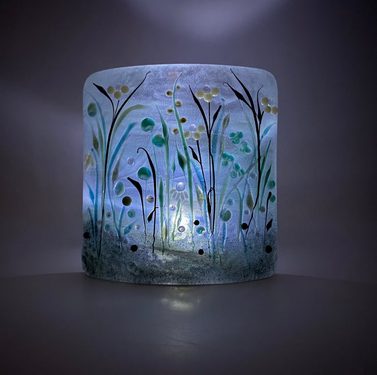 I've always been a stickler for detail which isn't always easy to achieve with fused glass. After many hours of 'playing' I created my meadows which are made up of tiny lamp worked flowers and foliage with gorgeous accents of sparkle from dichroic glass. The result is ethereal - delicate, feminine and quite positively dreamy!