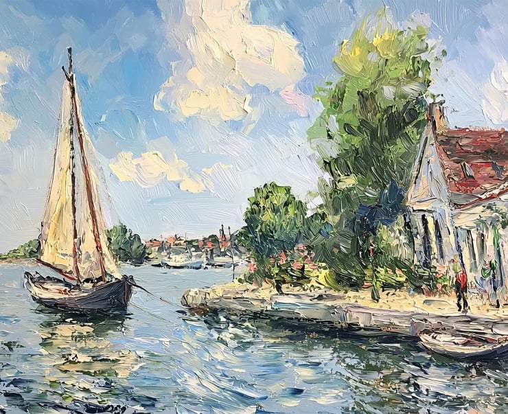 Start your day with a touch of artistic elegance using this Sailing Harbor Mug. Featuring a stunning impressionist seascape, this mug beautifully captures sailboats drifting on calm waters. Meanwhile, a charming coastal village rests in the background, set beneath a peaceful sky painted in soft, flowing brushstrokes. As a result, the vibrant colors blend seamlessly with textured details, bringing the artwork to life. Thus, this mug becomes a perfect gift for art lovers, sailors, and ocean enthusiasts.