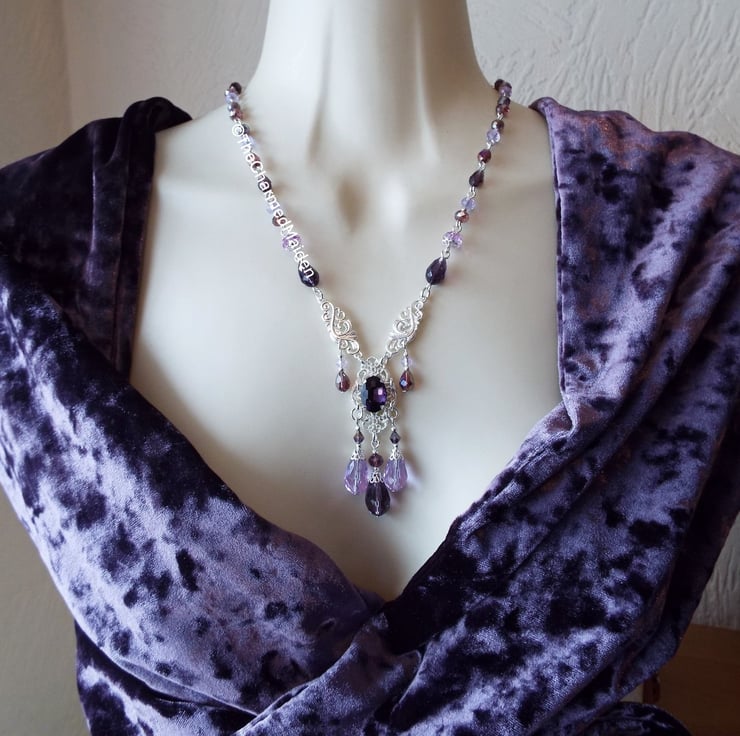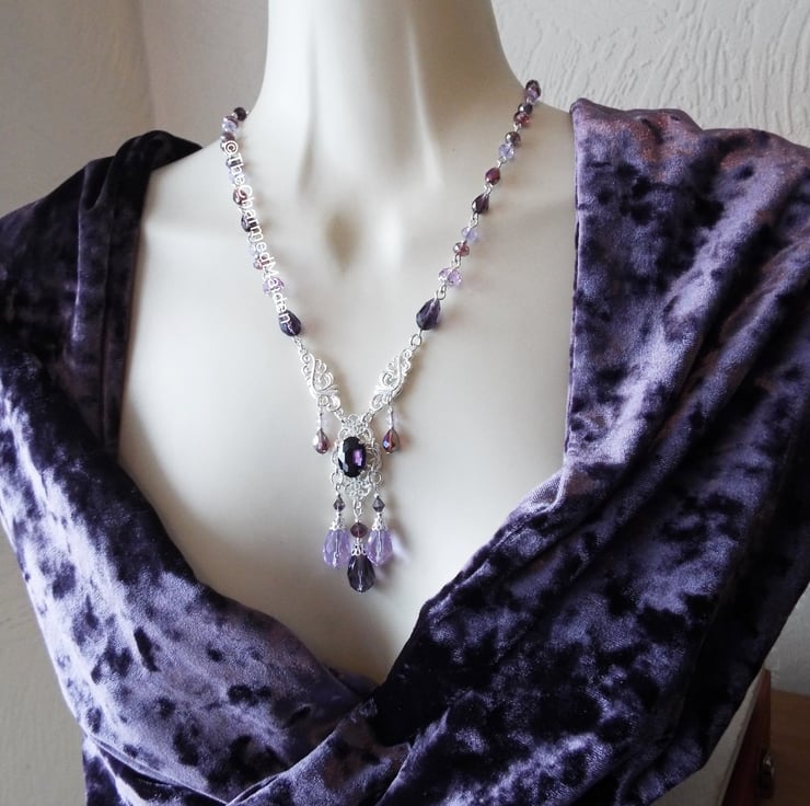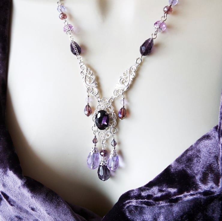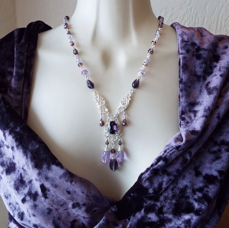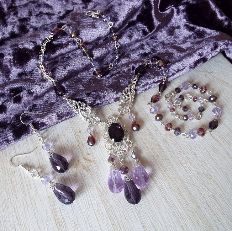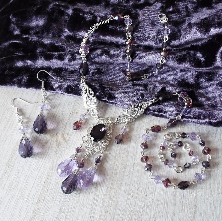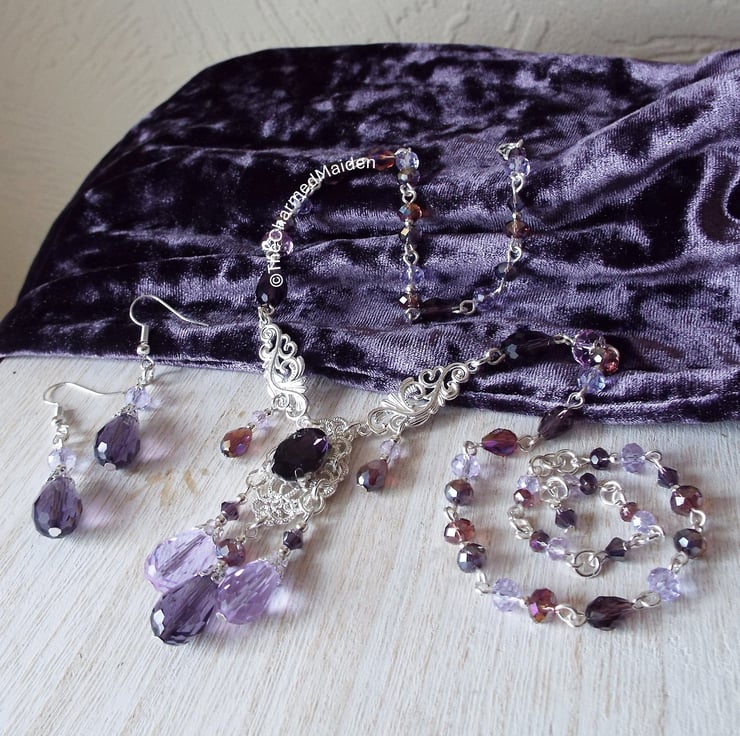 Stunning faceted crystal glass beaded necklace & earrings set in a myriad of purple from pale violet to dark amethyst. Silver plated filigree adornments & a multitude of faceted round, rondelle, bicone & teardrop glass beads. I have accented here & there with a smattering of silver plated filigree bead caps & finished the piece off with a beaded extender chain. Necklace fastens to the back with a silver plated lobster claw clasp. The earrings are finished with silver plated ear wires for pierced ears.