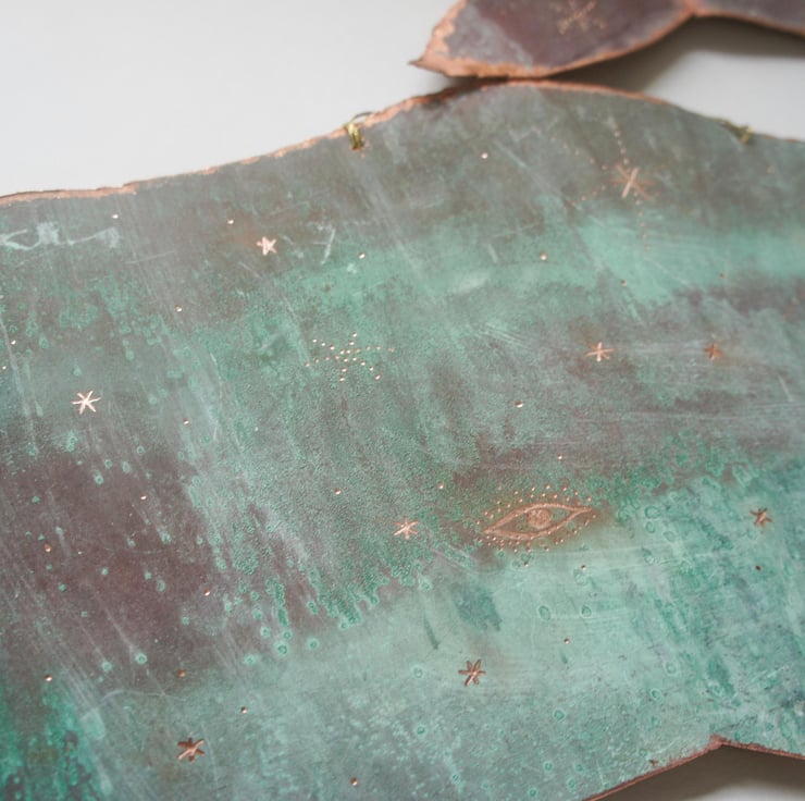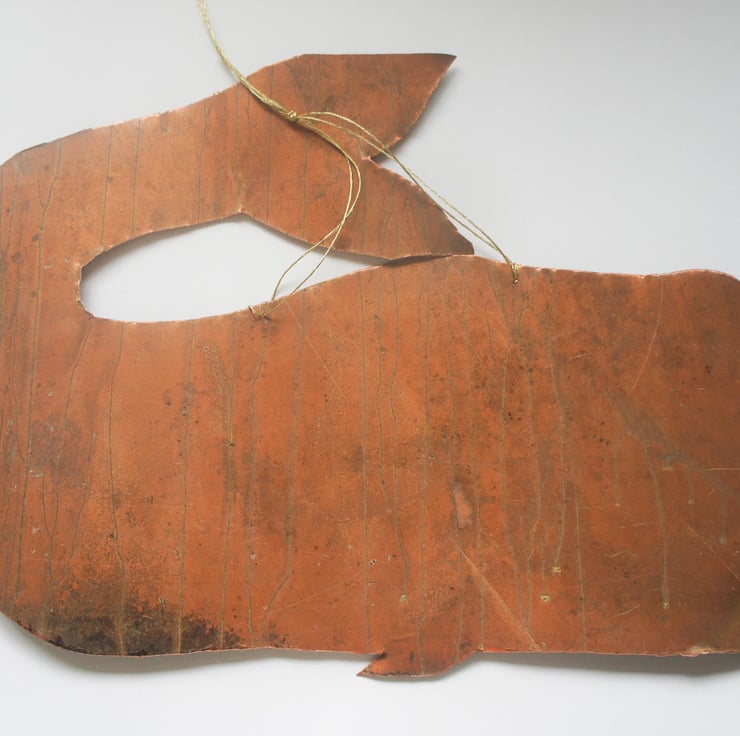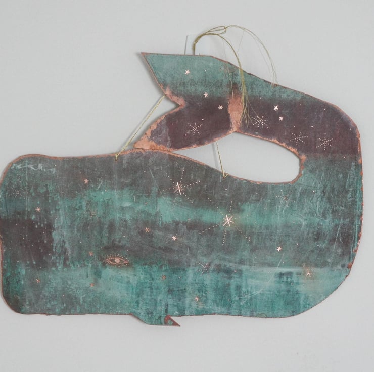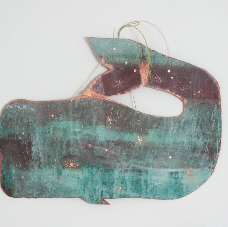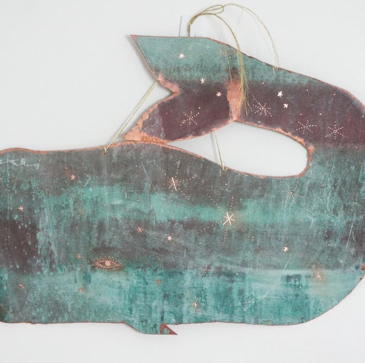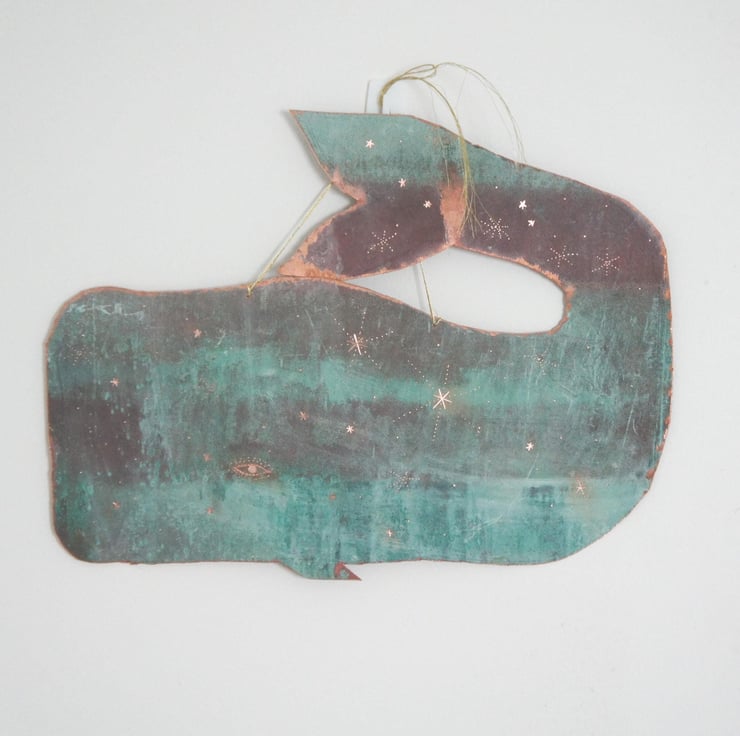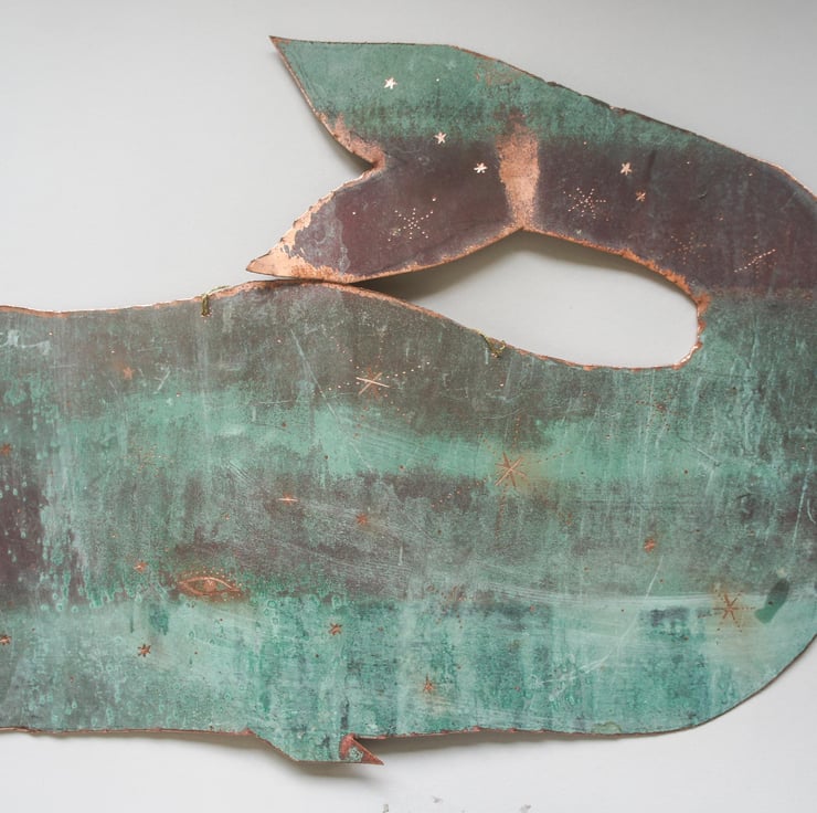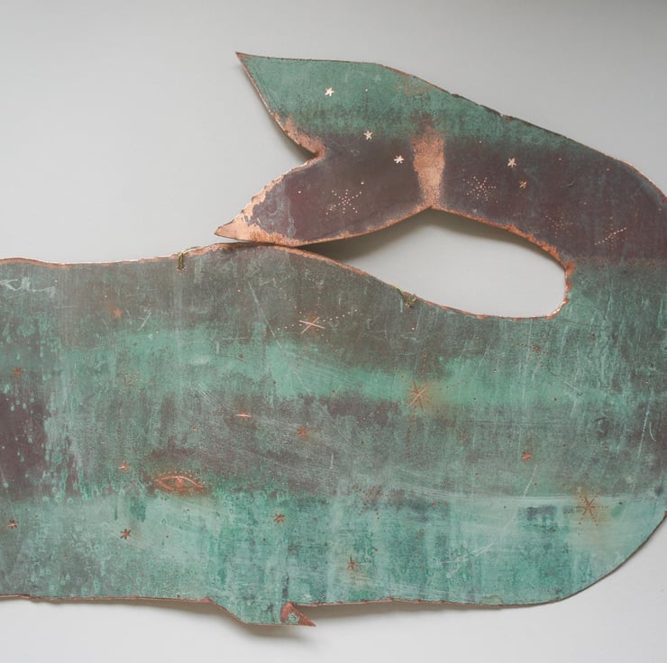 A one of a kind copper whale sculpture. Cut from upcycled copper that is a natural turquoise blue patina. The size of this whale is 34cm in length.