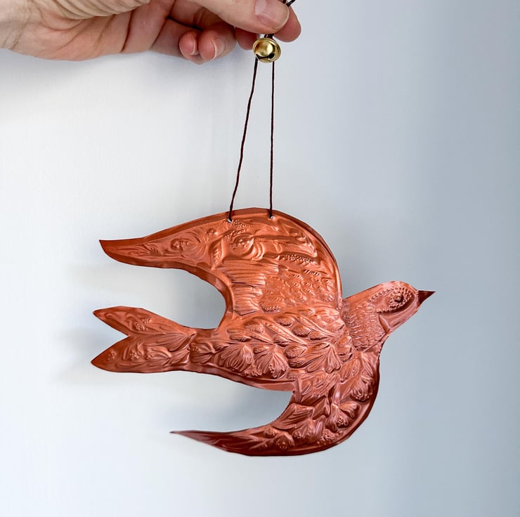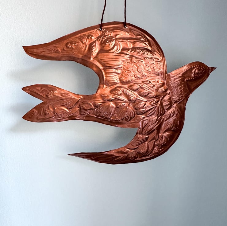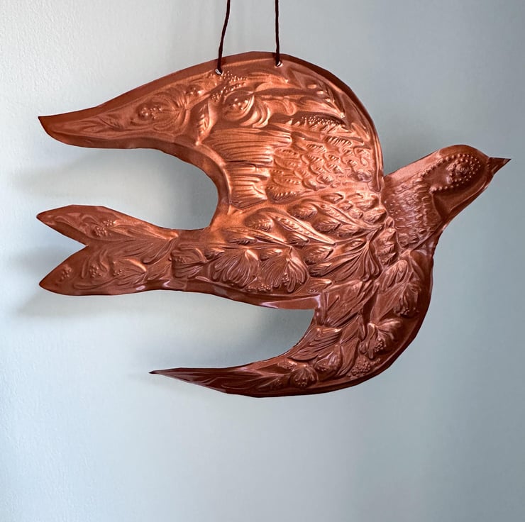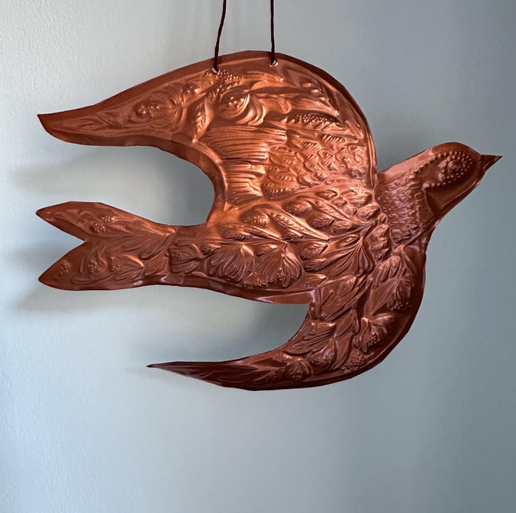 Handmade honeysuckle swallow copper foil decoration. A one of a kind hand embossed decoration threaded with red thread ready for hanging..